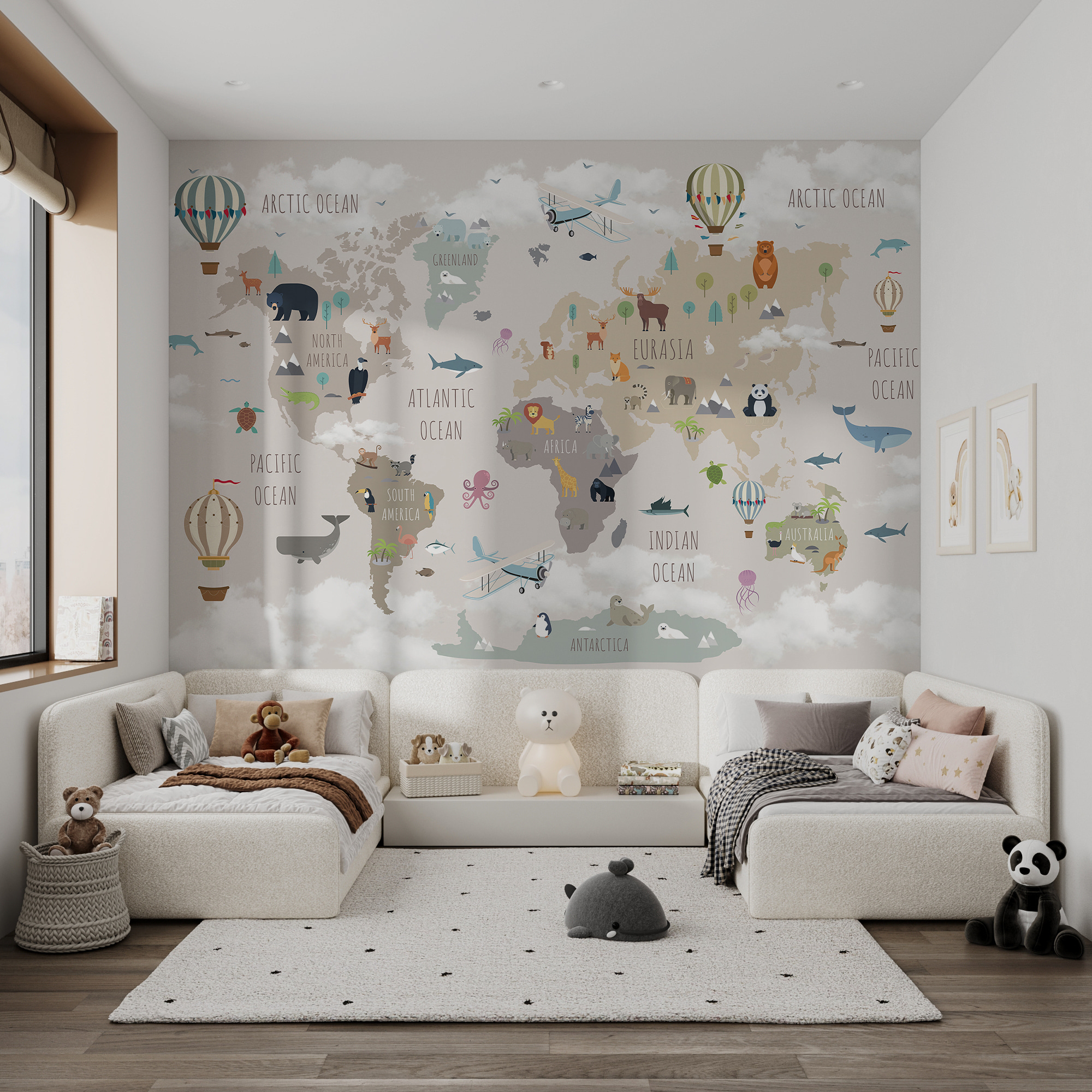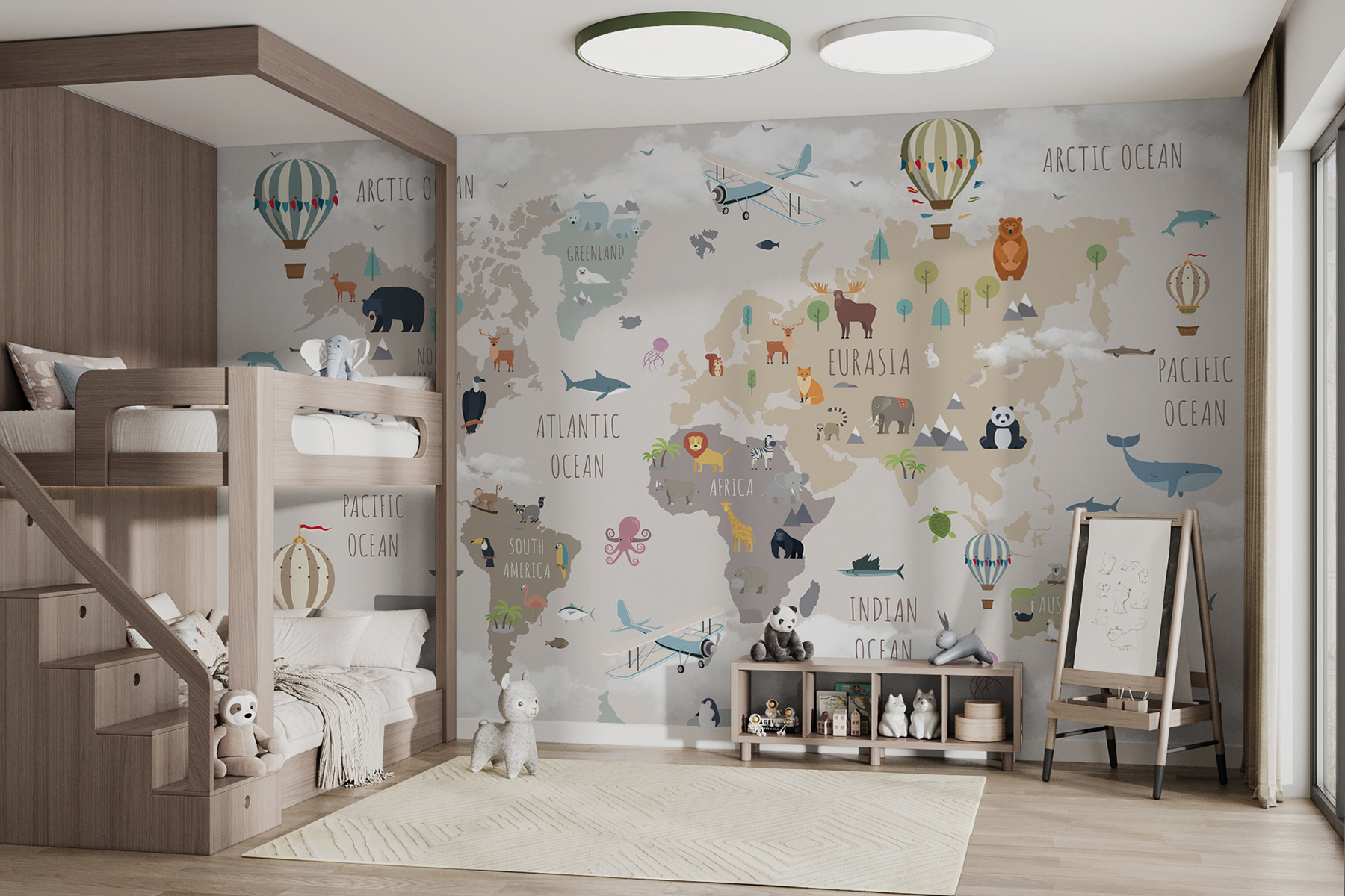 Este mural no es sólo decoración, es toda una experiencia. Los niños pueden aprender sobre los diferentes continentes y océanos mientras ven a sus animales favoritos, desde osos polares en Groenlandia hasta canguros en Australia. Los colores apagados son tranquilizadores, perfectos para los cuentos antes de dormir o las tardes de domingo. Es el tipo de decoración que despierta la imaginación y la curiosidad, por lo que es ideal para guarderías, salas de juegos o incluso aulas. Además, descubrir nuevos detalles cada día mantiene viva la magia.