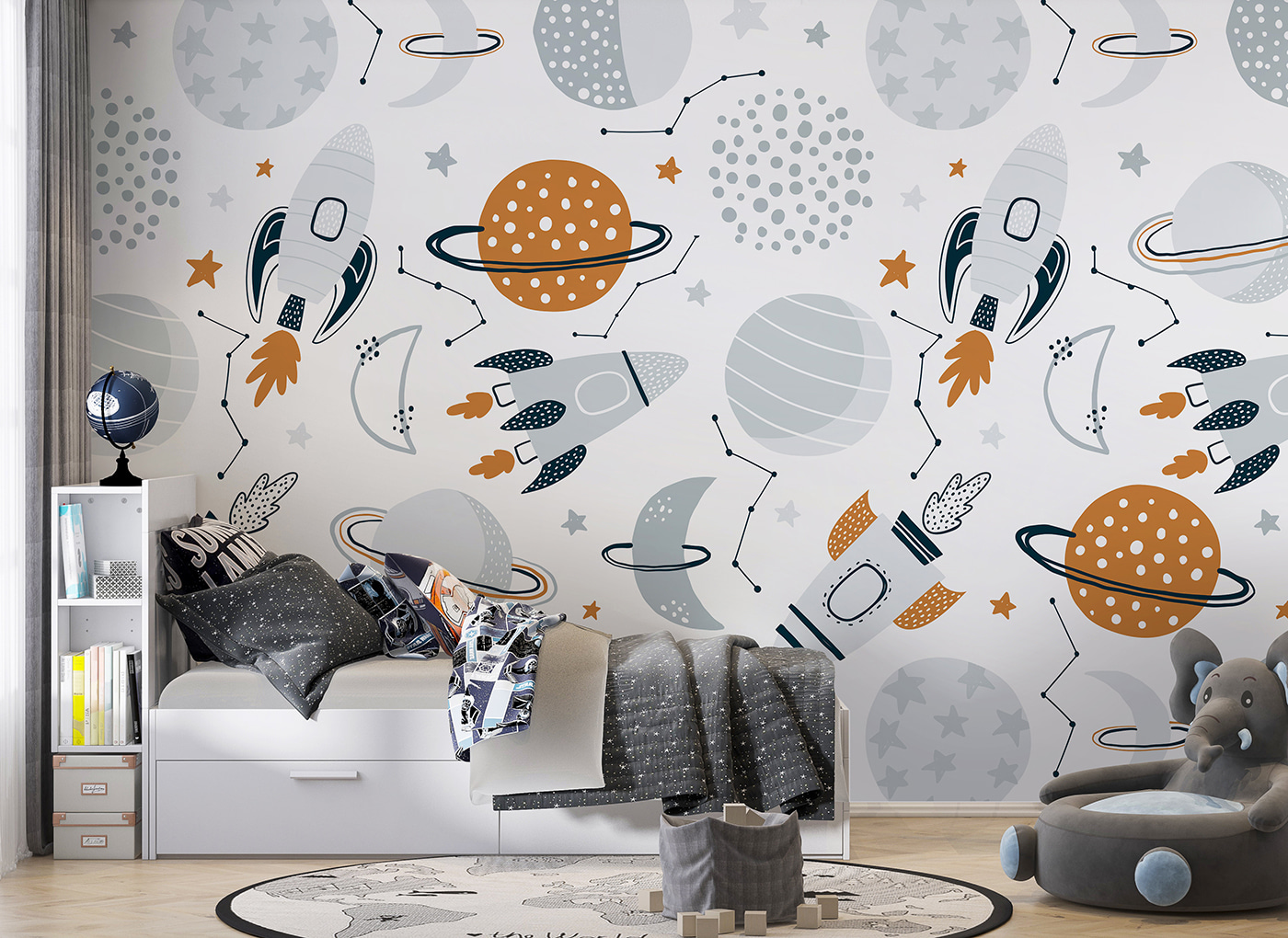 Imagínate los cuentos que se cuentan antes de dormir con este mural; en un momento están pilotando un cohete y al siguiente bailando entre las estrellas. Los colores suaves lo hacen relajante, mientras que los diseños detallados lo mantienen emocionante. Ya sea para una habitación infantil o una sala de juegos, este mural combina a la perfección aprendizaje y diversión, convirtiendo un espacio ordinario en un país de las maravillas cósmico.