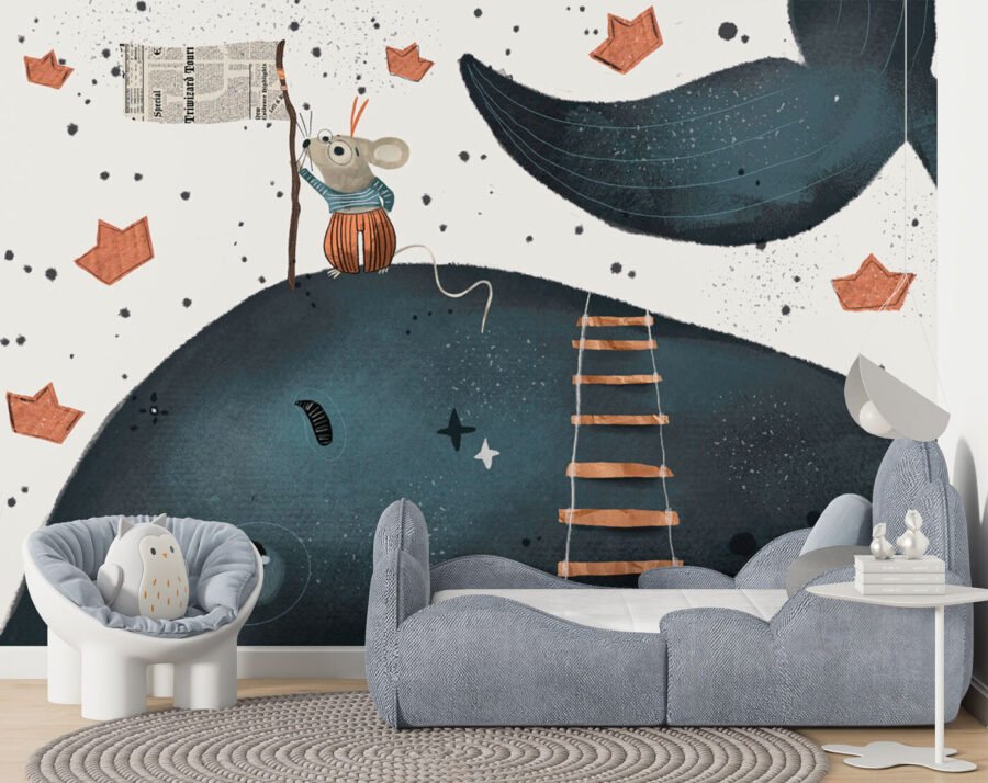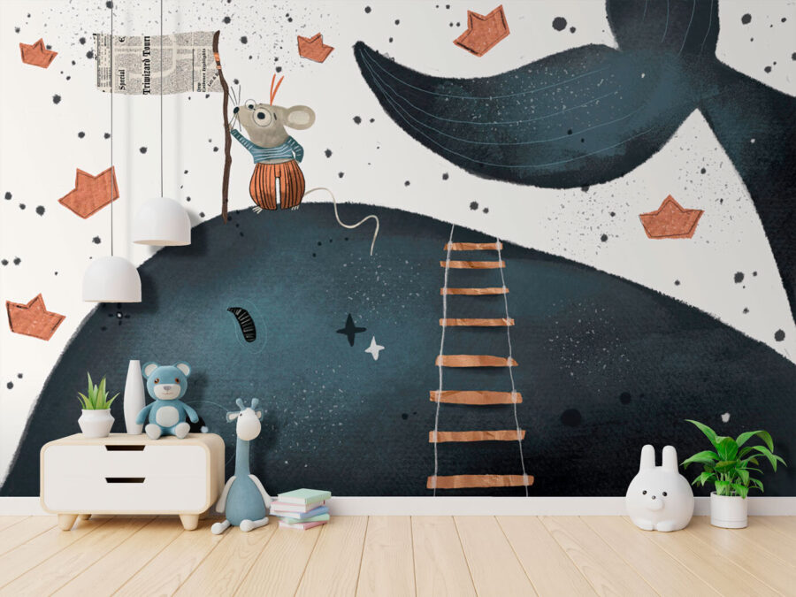 Transforma el espacio de cualquier niño en una caprichosa aventura con este encantador mural de pared. Imagínatelo: un alegre ratón subiendo valientemente una escalera, ondeando una bandera sobre una simpática ballena, rodeado de encantadores barquitos de papel. Es una historia visual que espera despertar la imaginación de los más pequeños.