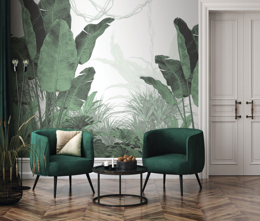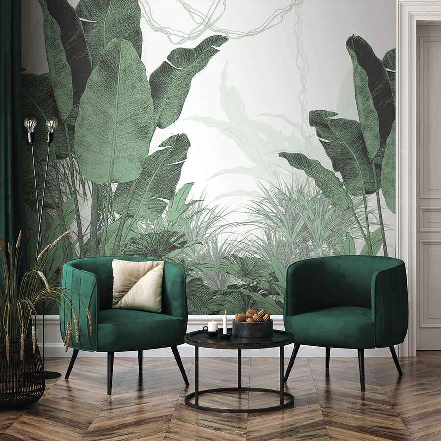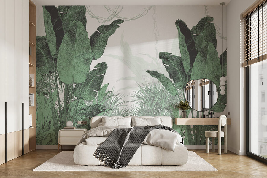 Transforme su espacio en un vibrante oasis con el mural de pared “Lush Greenery”. Piense en un exuberante follaje tropical directamente en su pared: es como entrar en una jungla sin humedad. Perfecto para añadir un toque de naturaleza a cualquier habitación, este mural aporta un relajante y frondoso verdor que le hará olvidar que está en el interior. Imagínese tomando su café de la mañana, rodeado de esta escena fresca y verde.