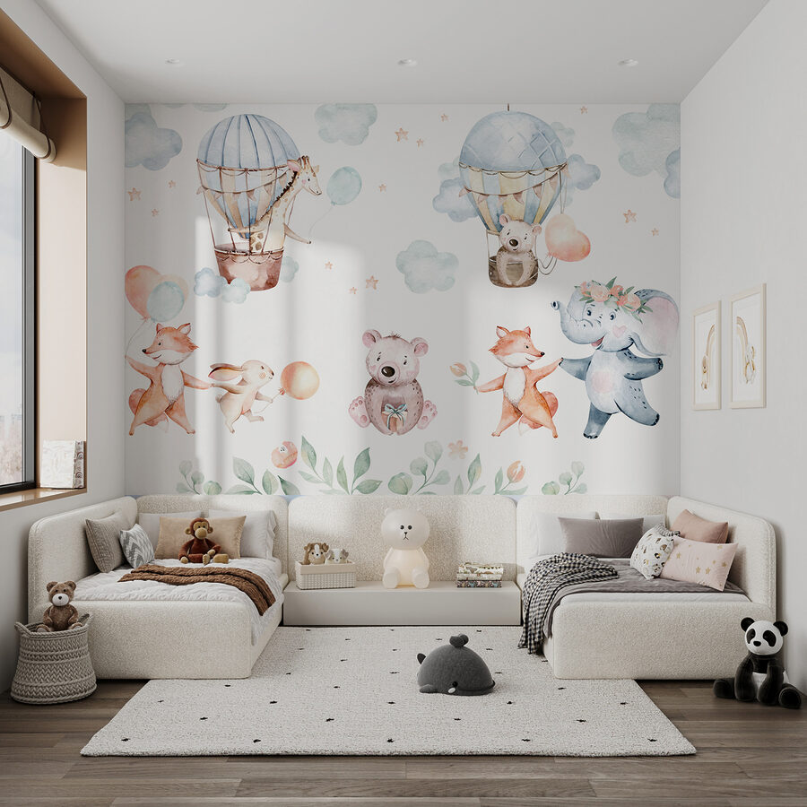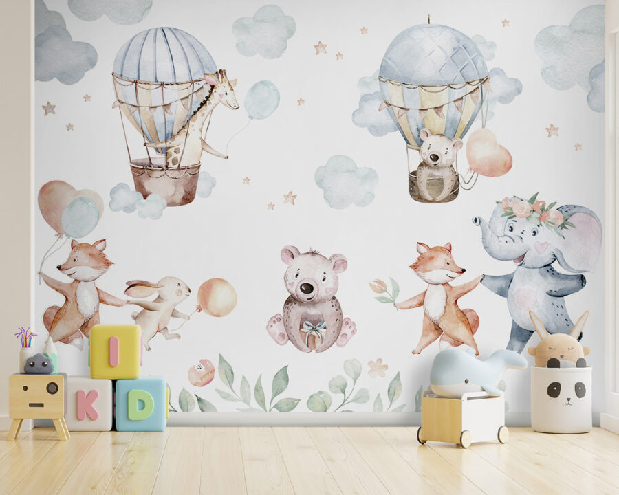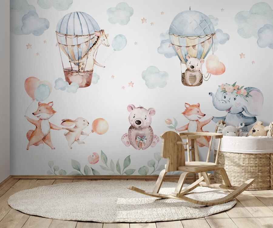 Imagine el placer absoluto de entrar en una habitación y ser recibido por una jirafa caprichosa flotando arriba, arriba y lejos en un globo de aire caliente. Perfecto para guarderías y habitaciones infantiles, este mural de pared “Jirafa en globo” aporta un toque mágico a cualquier espacio. Encantador, ¿verdad? Es como sumergirse directamente en una aventura de ensueño donde la imaginación no tiene límites. Añada las nubes esponjosas y los animales sonrientes, y sentirá como si la pared le diera un cálido abrazo.