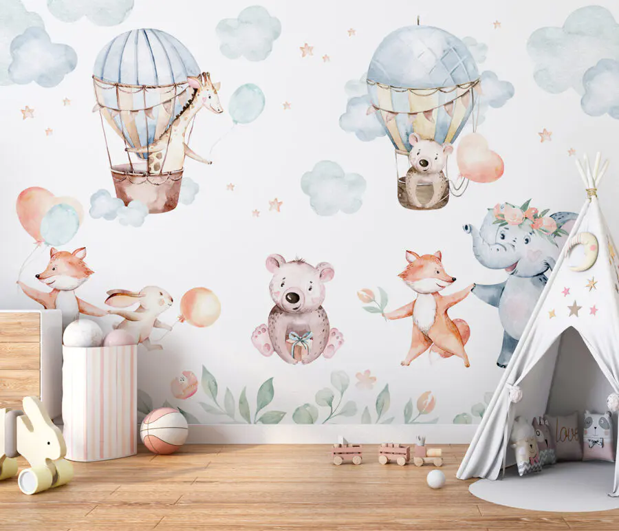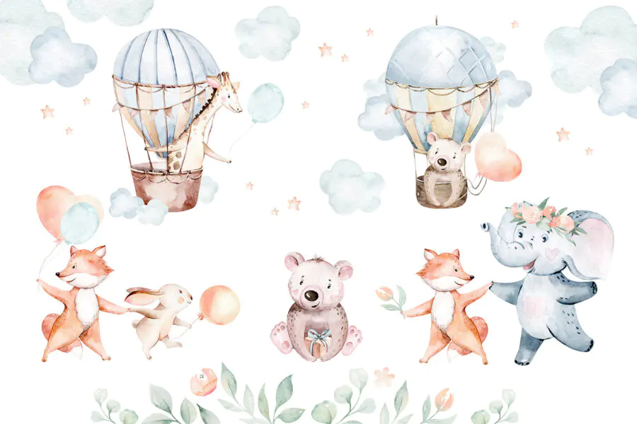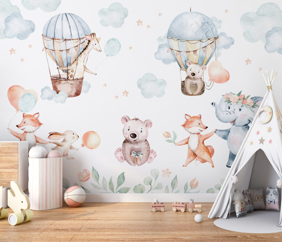 Imagine el placer absoluto de entrar en una habitación y ser recibido por una jirafa caprichosa flotando arriba, arriba y lejos en un globo de aire caliente. Perfecto para guarderías y habitaciones infantiles, este mural de pared “Jirafa en globo” aporta un toque mágico a cualquier espacio. Encantador, ¿verdad? Es como sumergirse directamente en una aventura de ensueño donde la imaginación no tiene límites. Añada las nubes esponjosas y los animales sonrientes, y sentirá como si la pared le diera un cálido abrazo.