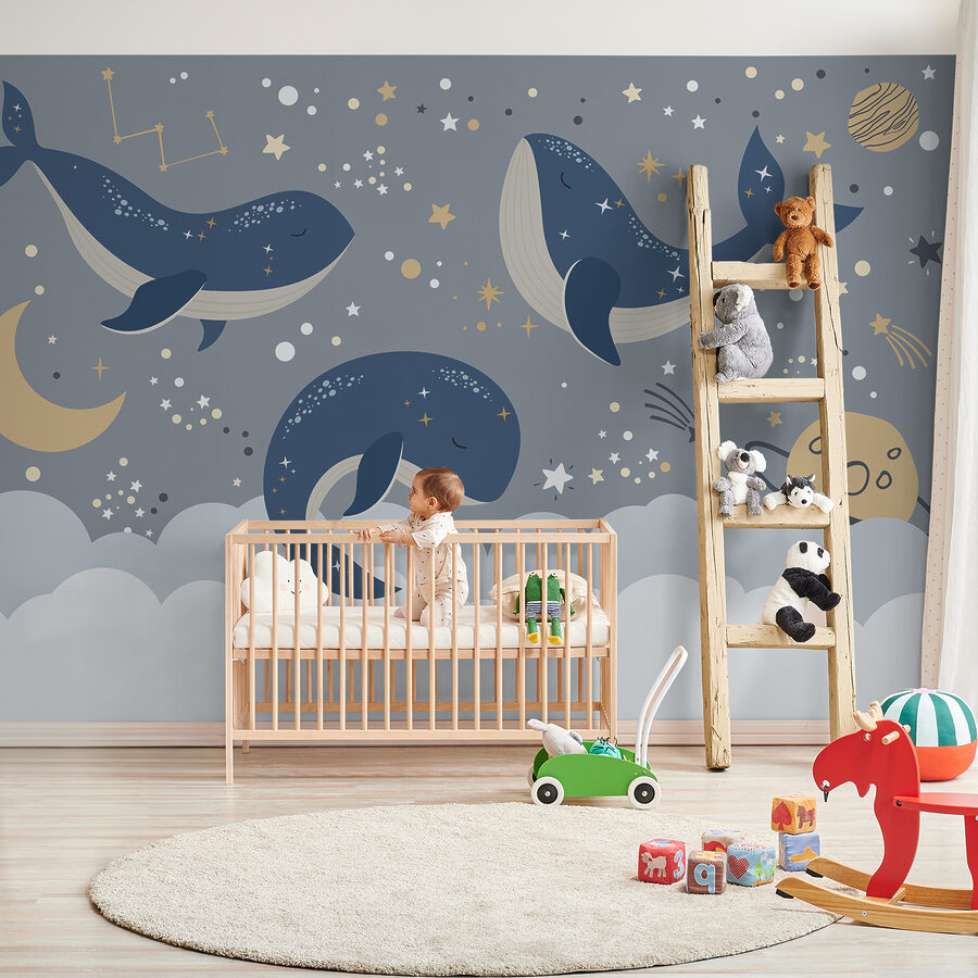 ¿Quieres añadir un toque de asombro a la habitación de tu hijo? Echa un vistazo a este “Mural de pared Ballena azul con cola blanca y estrellas” de ensueño. Imagínatelo en la pared de tu hijo: es como si tuviera su propio trozo de cielo nocturno, con una adorable ballena azul flotando suavemente en un mar de estrellas y constelaciones. Perfecto para la guardería o el espacio de cualquier pequeño aventurero, añade el toque justo de magia y serenidad. Además, esas ballenas adormiladas parecen prometer dulces sueños a cualquiera que duerma bajo ellas. Es caprichosa, tranquilizadora y un poco juguetona: un telón de fondo encantador para los cuentos antes de dormir y las siestas vespertinas. Ya sea para tu hijo o hija, o para esos momentos de acurrucamiento con tu bebé, transforma cualquier pared en una relajante aventura a la luz de las estrellas.