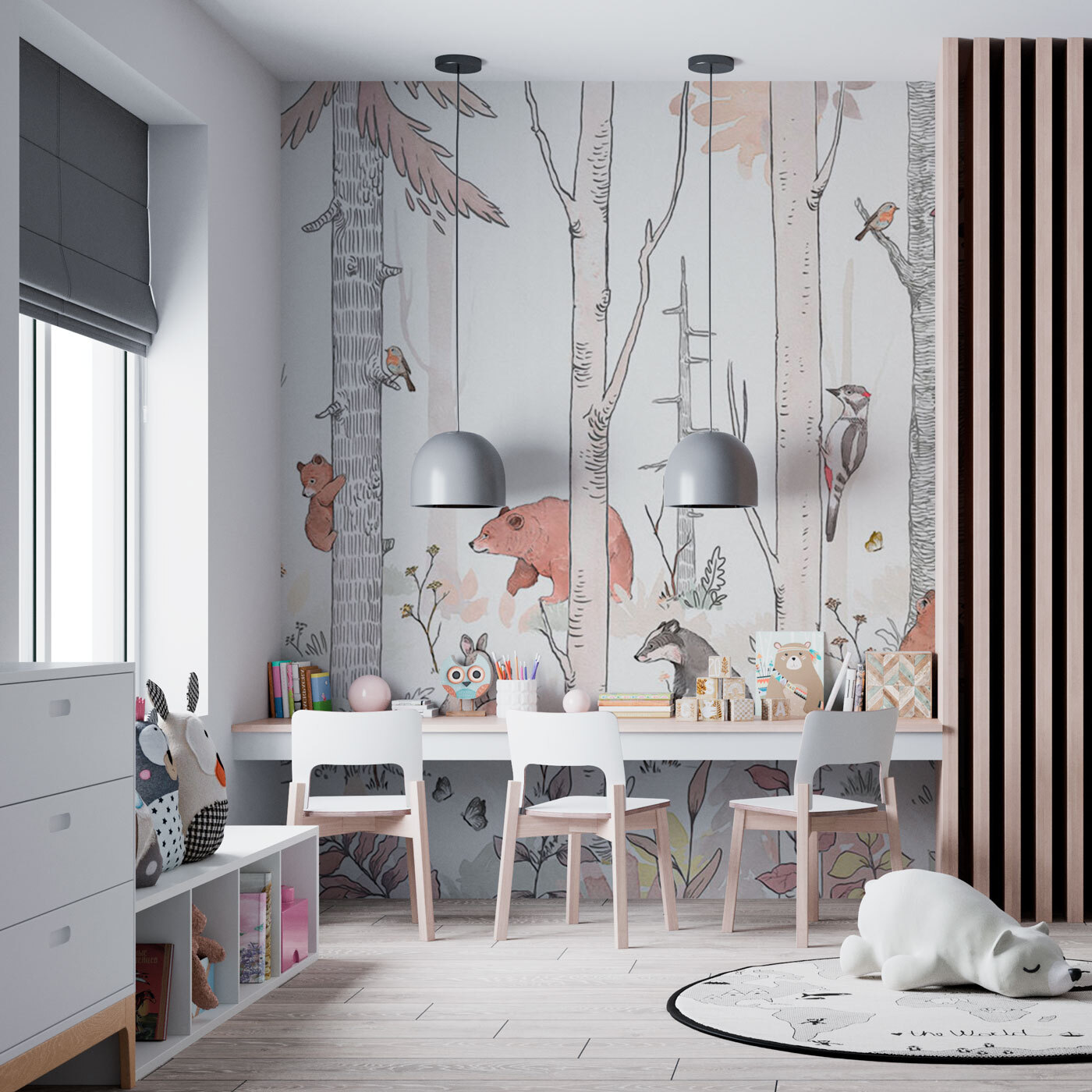 Imagina un acogedor bosque en el cuarto de los niños: ¡eso es exactamente lo que te ofrece este mural! “Grupo de animales en un bosque” es como abrir un libro de cuentos directamente en tu pared. Está lleno de encantadoras criaturas del bosque: ardillas curiosas, conejitos saltarines, osos perezosos e incluso un ciervo pensativo que llama tu atención. Los colores suaves y terrosos le dan un aire tranquilo y mágico. Ya sabes, como el tipo de lugar que soñarías explorar de niño. ¿Y los niños? Les encantará. E incluso los adultos encontrarán un poco de paz y fantasía en su encanto. Imagínate cuentos para dormir con este telón de fondo: ¡aventura instantánea! No es sólo un mural, es todo un mundo nuevo en el que perderse. Perfecto para guarderías, salas de juegos o cualquier lugar donde necesites un toque de magia del bosque. Crea recuerdos y despierta la imaginación desde tu pared.