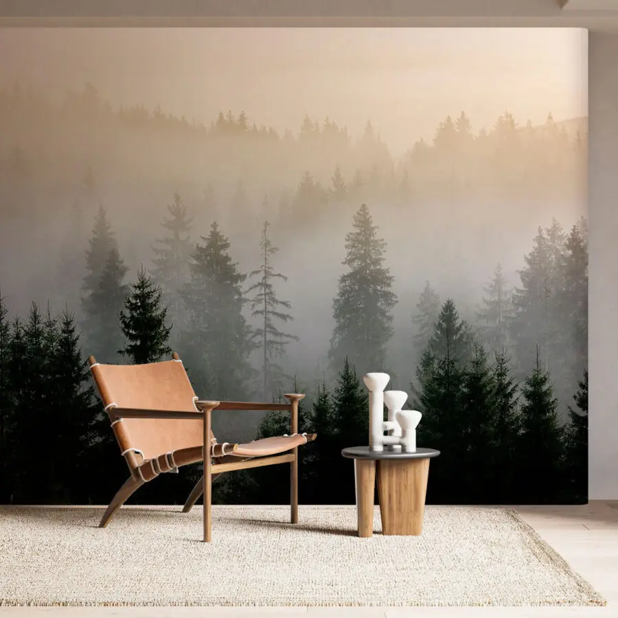 Adéntrese en un mundo de ensueño con este impresionante mural de árboles en la niebla. Imagínese tomando café en un rincón acogedor, mientras la suave niebla envuelve su espacio, haciendo que todo parezca sereno y tranquilo. Es como traer un poco del bosque a su hogar. Las capas de verde y gris bailan juntas, creando una sensación de calma que susurra los secretos de la naturaleza.