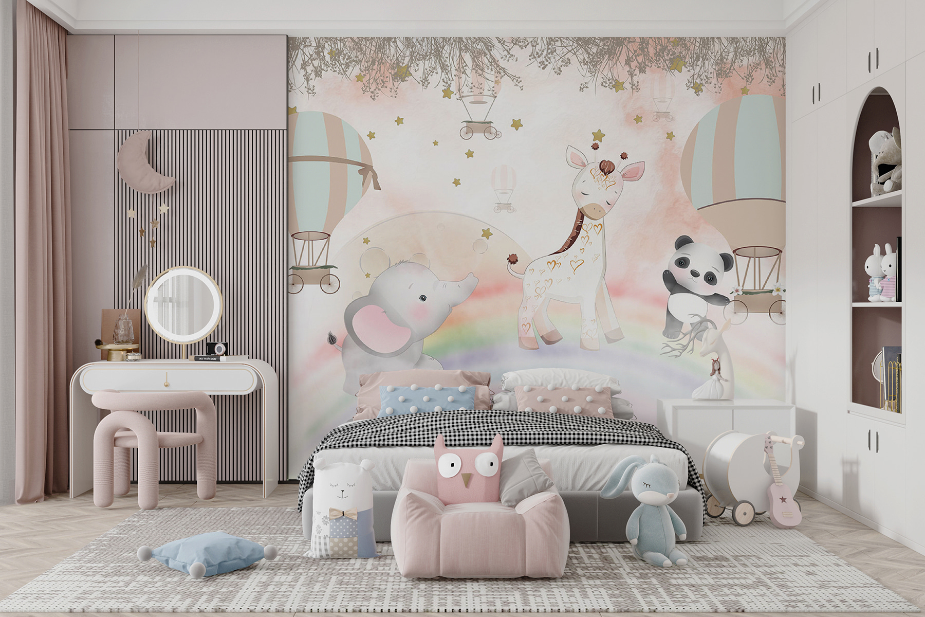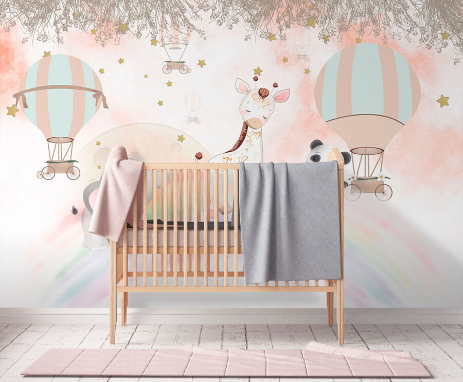 Alegra la habitación de cualquier niño con este encantador mural de globos aerostáticos. Imagínate un cielo de ensueño lleno de caprichosos globos flotando sobre adorables animales, como una encantadora jirafa, un juguetón panda y un dulce elefantito. Es una escena que invita a la aventura y despierta la imaginación. Imagina a los más pequeños contemplándola, dejándose llevar al país de los sueños, soñando con elevarse por encima de las nubes. Los colores suaves crean un ambiente acogedor, perfecto para los cuentos de antes de dormir. Este mural no es sólo decoración; es una puerta a un mundo de fantasía. ¿Quién no querría unirse a esos paseos en globo? Transformará cualquier espacio en un paraíso de diversión.