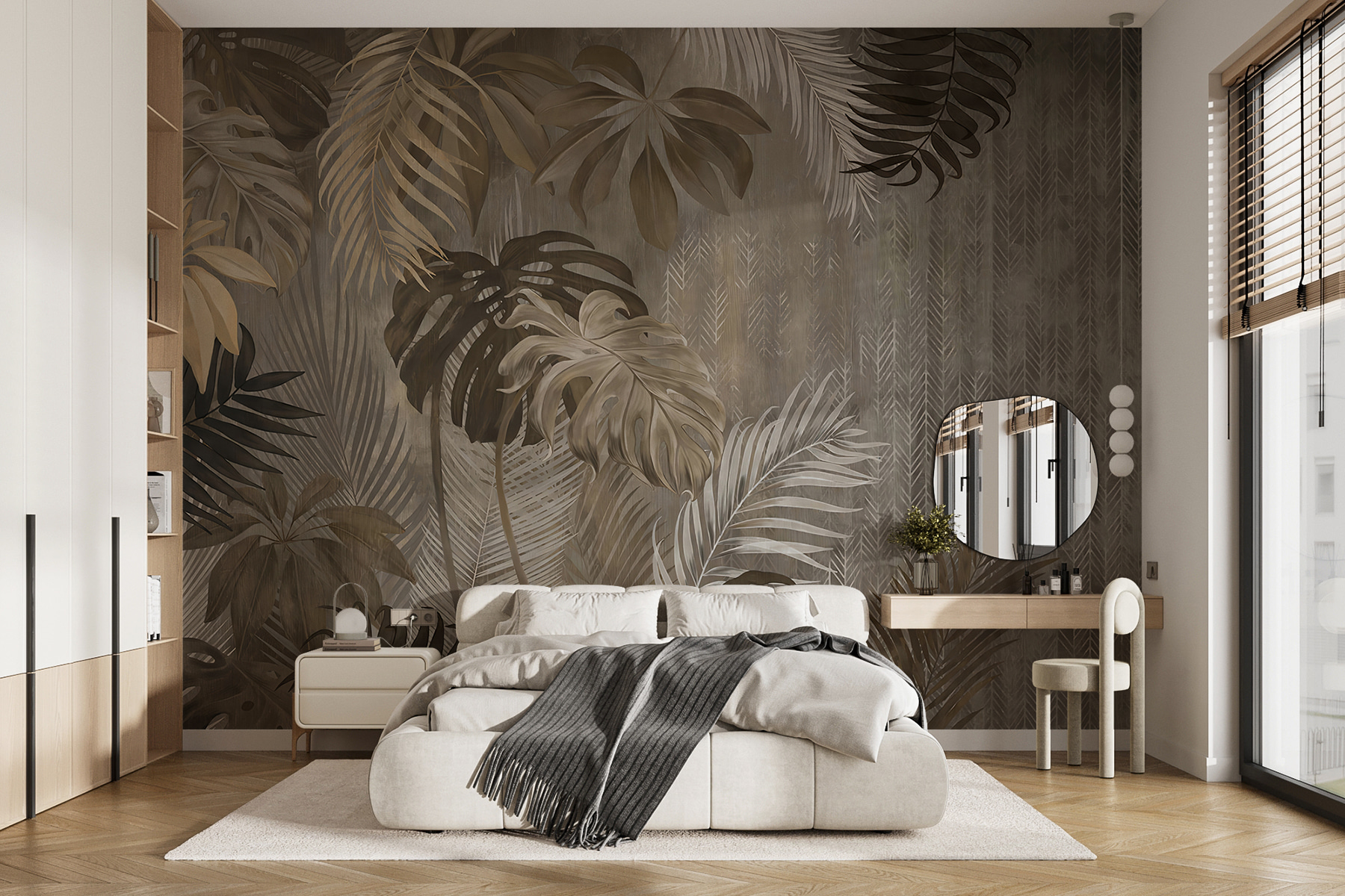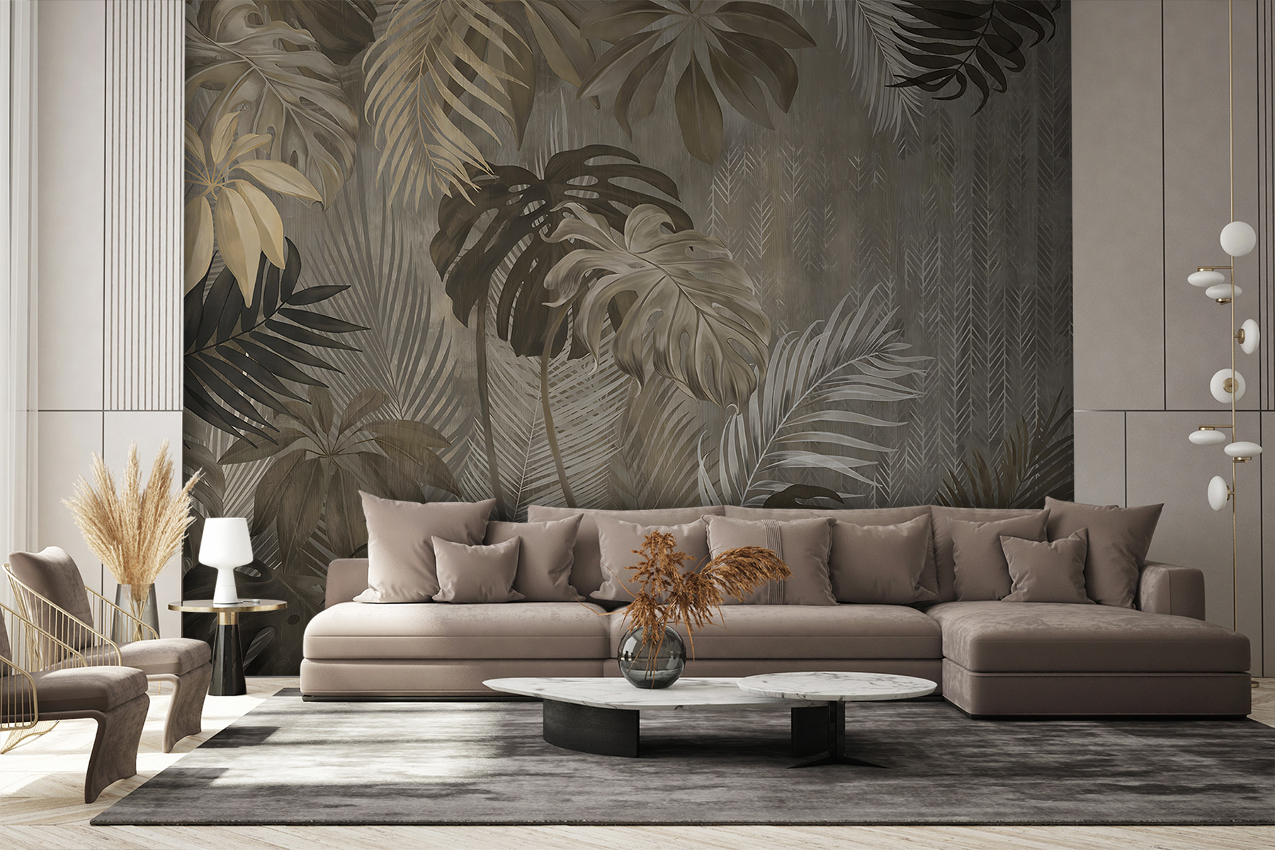 Transforme una pared aburrida en un paraíso tropical con este mural de elegantes hojas sobre un fondo bellamente variado. Imagínese que entra en una acogedora habitación y se siente como si hubiera entrado directamente en una exuberante selva, sin los mosquitos, por supuesto. Los tonos terrosos desprenden calma y te envuelven en un cálido abrazo. Perfecto para los que anhelan la naturaleza pero viven lejos de ella. Tus amigos te preguntarán si te has ido de vacaciones a la selva. Es más que arte: es una escapada diaria, una forma de disfrutar del aire libre sin salir de casa.
