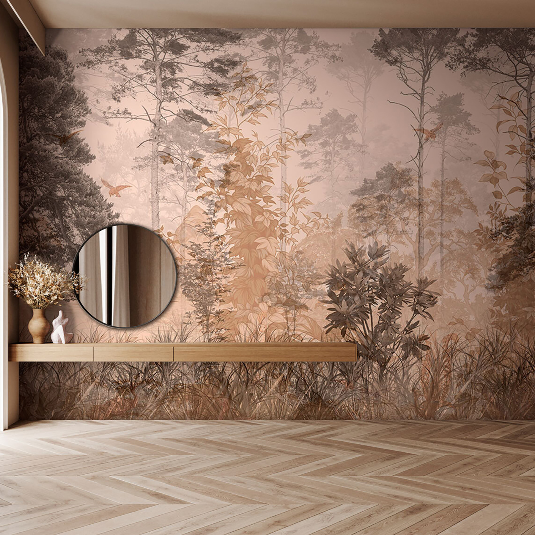 Los tonos apagados aportan un ambiente tranquilo, perfecto para relajarse tras un largo día. Imagínate tomando el té y perdiéndote en los detalles de los árboles y las hojas. Es como si el bosque cobrara vida en tu pared, ¡sin los bichos, claro! Ideal para cualquiera que necesite un poco de evasión, sin salir de casa. Este mural no sólo decora, sino que transforma, creando un refugio acogedor que resulta perfecto.