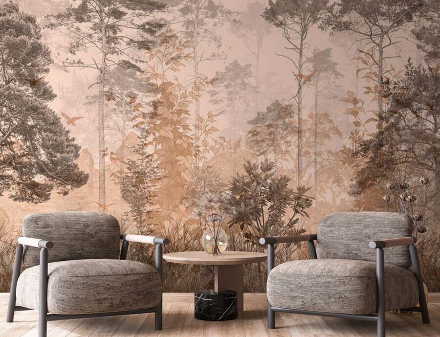 Los tonos apagados aportan un ambiente tranquilo, perfecto para relajarse tras un largo día. Imagínate tomando el té y perdiéndote en los detalles de los árboles y las hojas. Es como si el bosque cobrara vida en tu pared, ¡sin los bichos, claro! Ideal para cualquiera que necesite un poco de evasión, sin salir de casa. Este mural no sólo decora, sino que transforma, creando un refugio acogedor que resulta perfecto.