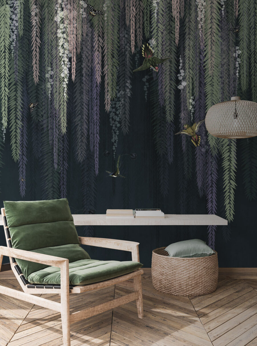 Imagínese que entra en un espacio en el que le transportan instantáneamente a un bosque sereno con pájaros bailando graciosamente en el aire. Este mural “Pájaro volando en el aire” es pura magia para cualquier habitación. La exuberante vegetación y los apacibles pájaros crean un ambiente casi de cuento de hadas, perfecto para un dormitorio o un acogedor rincón de lectura.