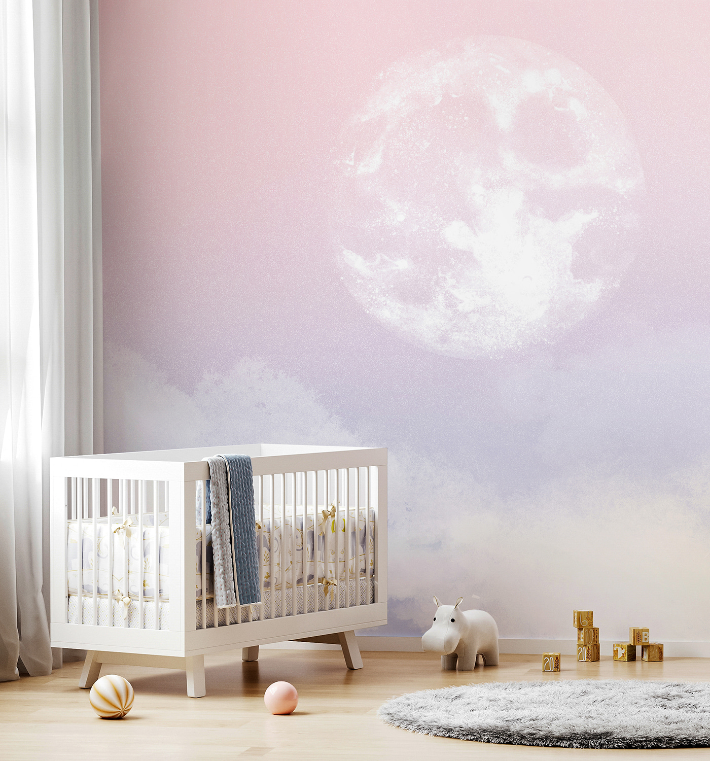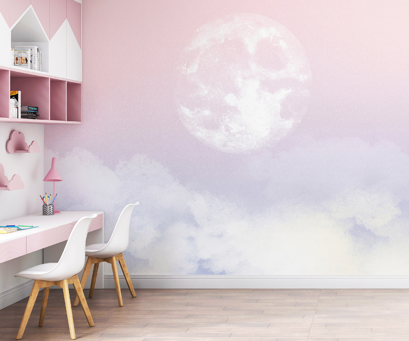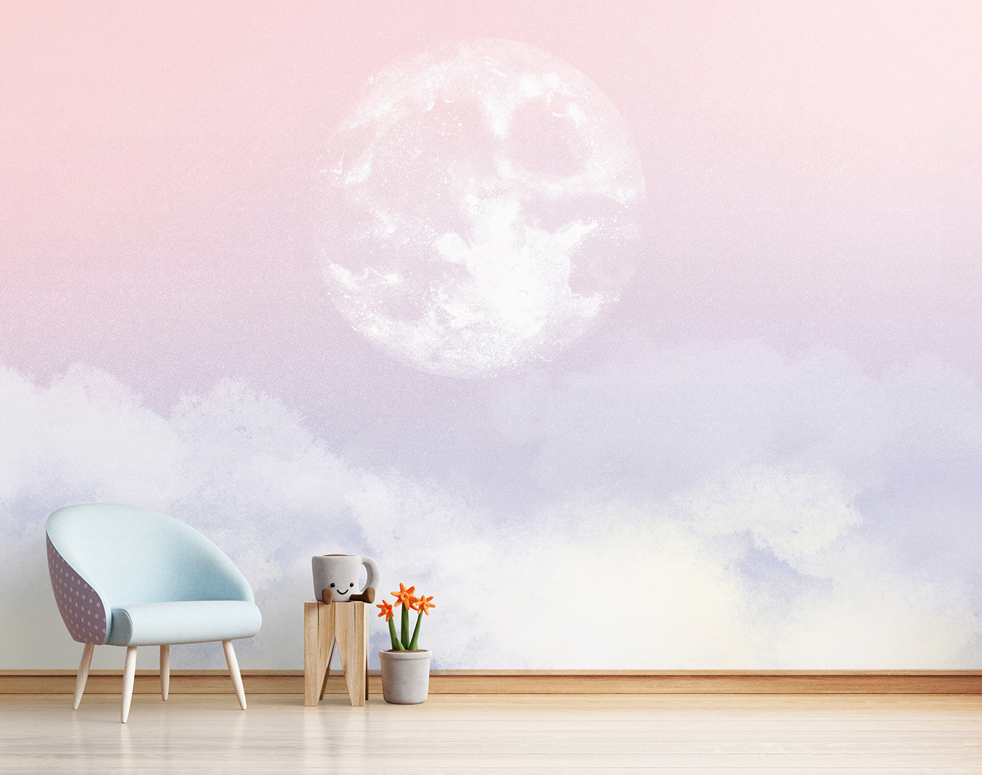 Este mural de ensueño “Luna en el cielo” parece sacado de un cuento para dormir. Imagina esta hermosa luna proyectando un suave resplandor sobre la habitación de tu hijo, creando un ambiente sereno y de otro mundo. Los tonos pastel del rosa y el azul son perfectos para el espacio de los más pequeños: sutiles pero encantadores.