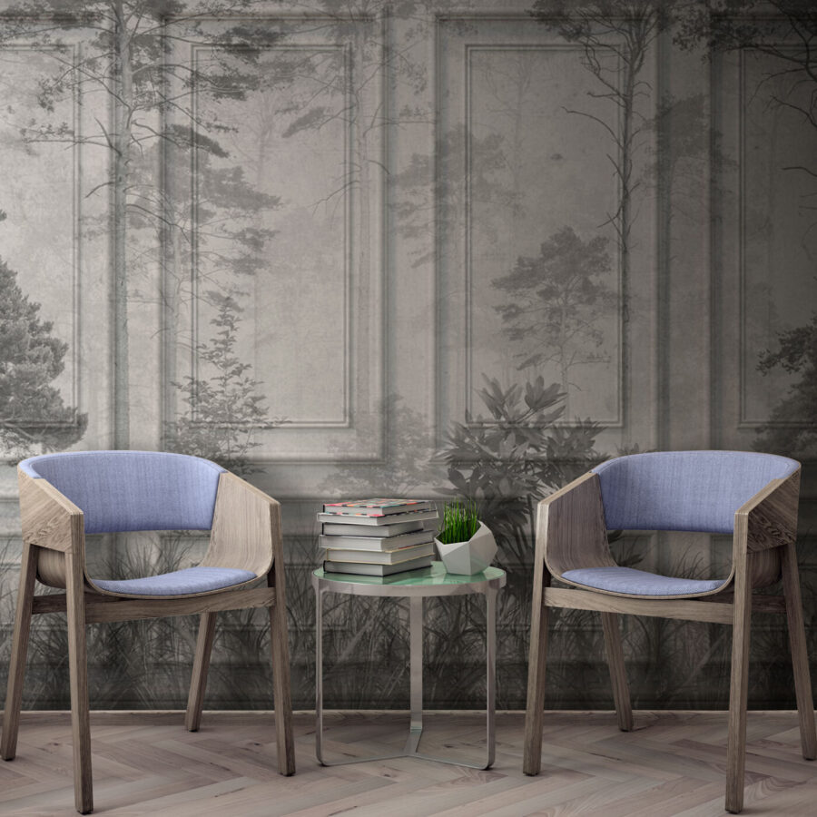 Imagine entrar en una habitación donde la naturaleza se combina con la arquitectura clásica. Eso es lo que hace este mural de pared: es como llevar una serena escena forestal a una elegante biblioteca. Los tonos apagados se mezclan suavemente, como si se tratara de una novela atemporal en un día lluvioso. Tiene un efecto calmante, perfecto para un rincón de lectura o una sala de estar en la que simplemente quieres respirar tranquilo. ¿La textura con efecto boiserie? Oh, añade este toque sofisticado, haciendo que su espacio se sienta elegante pero acogedor. Los invitados quedarán impresionados, pero lo más importante es que tú sentirás que tienes un pedazo de tranquilidad en casa.