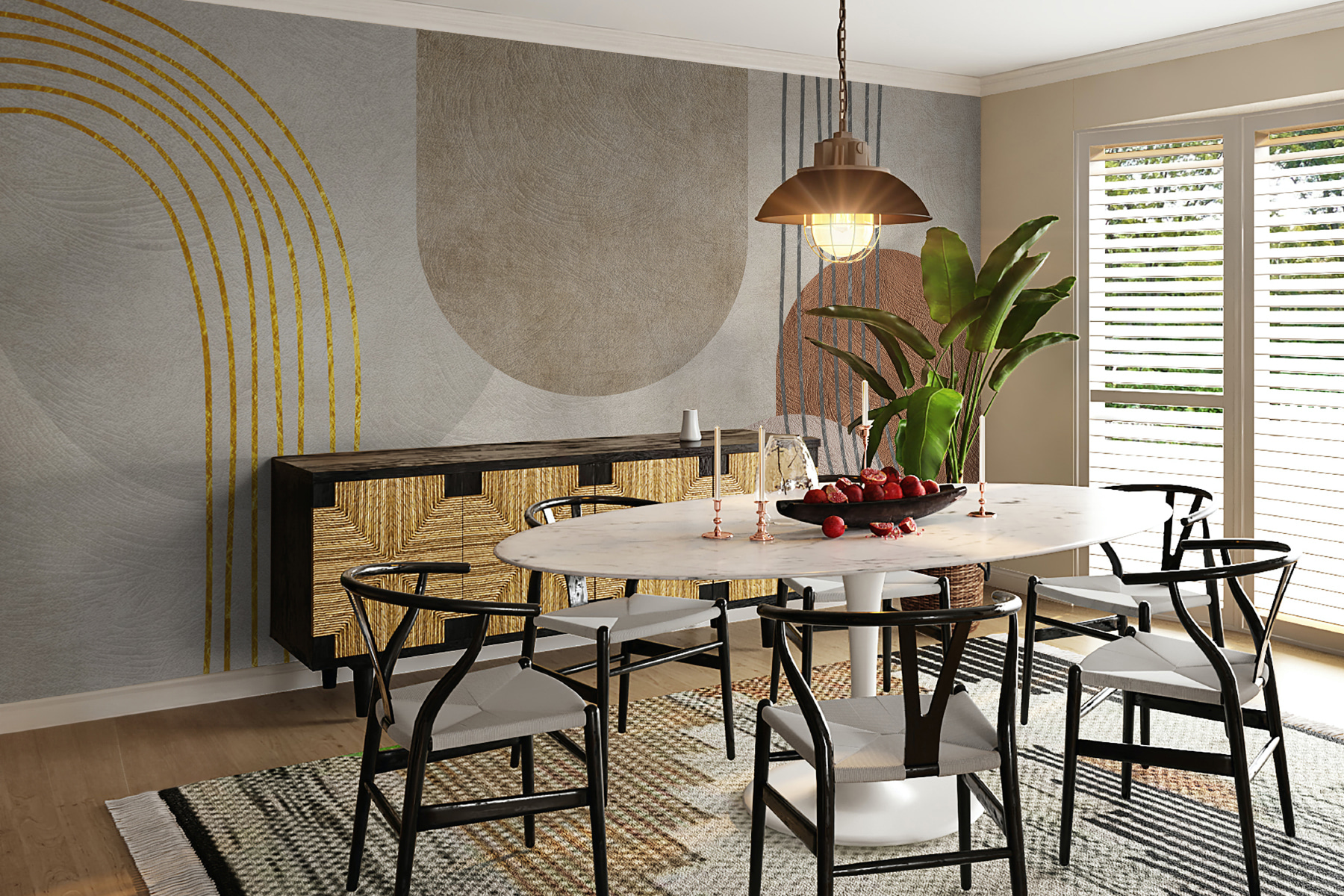 Transforme su espacio con este impresionante mural geométrico abstracto, donde los tonos tierra bailan juntos como viejos amigos en una reunión. Imagínese entrar en una habitación que susurra calidez y creatividad, invitándole a detenerse y reflexionar. Las suaves curvas y líneas crean un ritmo calmante, perfecto para noches acogedoras o mañanas inspiradoras. Este mural añade un toque de elegancia artística, armonizando con los muebles y la decoración, a la vez que despierta la curiosidad justa. No es sólo una pared, es una experiencia. ¿Quién no querría pasar un rato así?