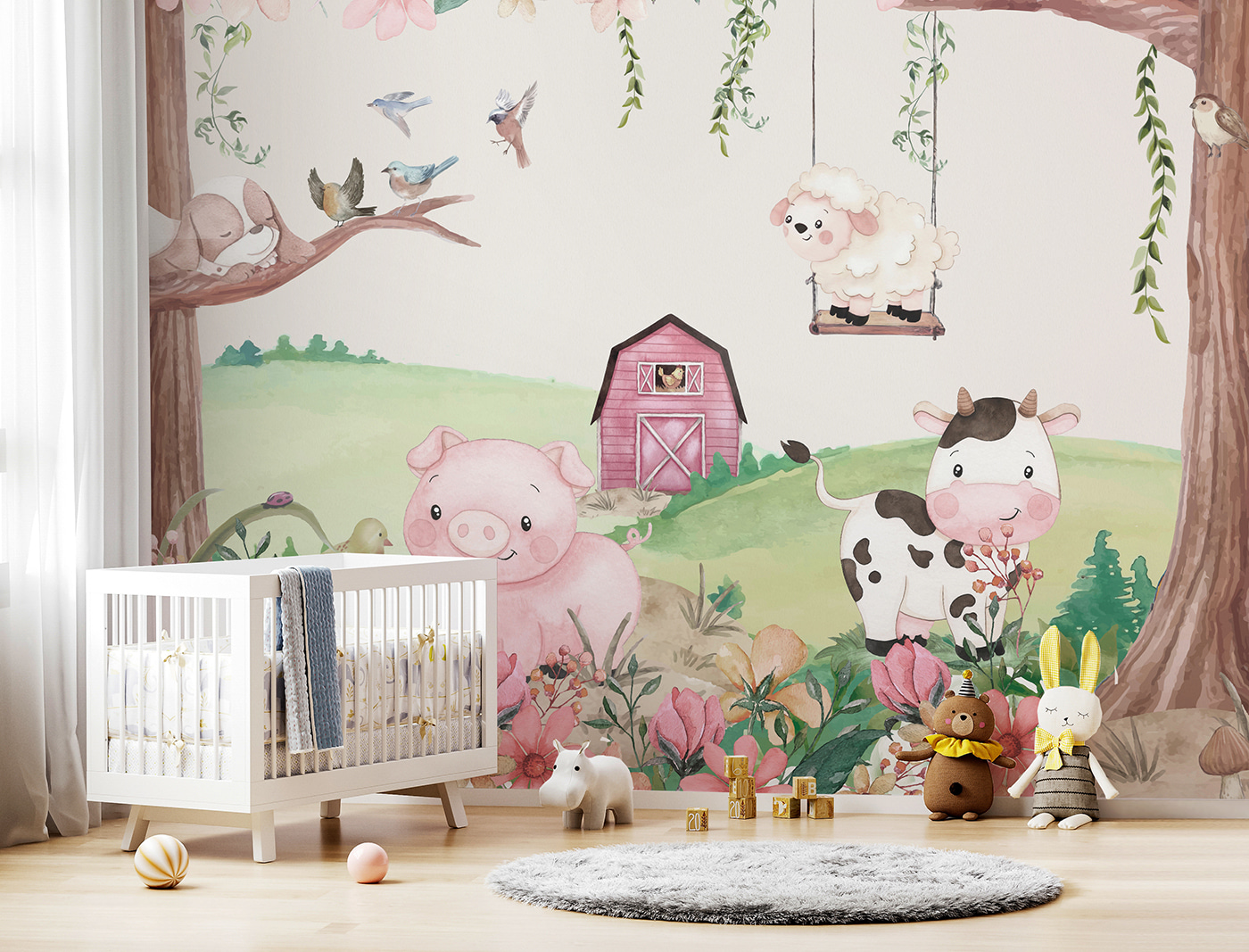 Los colores suaves y las alegres ilustraciones lo hacen muy acogedor. ¿Te imaginas un acogedor rincón de lectura o una zona de juegos con esto en la pared? Es el telón de fondo perfecto para todo tipo de aventuras, ¡incluso para un divertido espectáculo de marionetas con los animales como público! Y esos pequeños detalles, como el cerdo sonriente y la vaca feliz, son garantía de sonrisas. Además, tiene algo muy relajante, un suave recuerdo de tiempos más sencillos y días de juego.