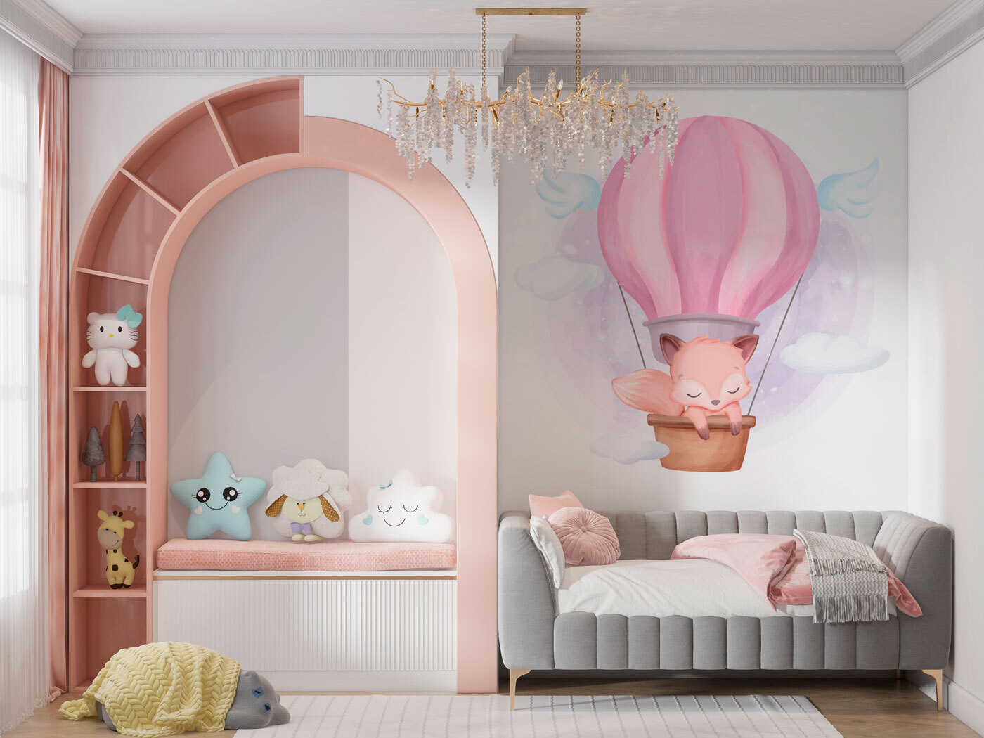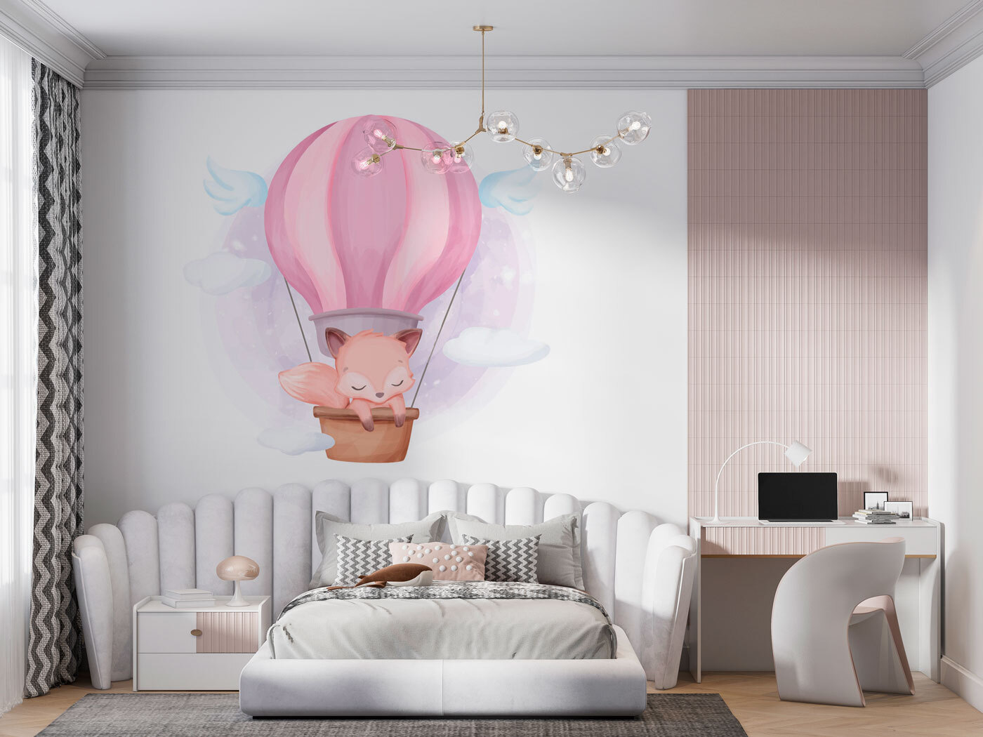 Imagínese flotando en el país de los sueños sobre una nube esponjosa, ¡con un globo aerostático rosa que le lleve hasta allí! Este mural de pared “Globo aerostático rosa” es perfecto para una habitación infantil, ya sea para su hijo aventurero o para su pequeña hija soñadora. Los colores pastel de ensueño y el adorable zorro dormilón hacen que este mural se sienta como un cálido abrazo. Añade el toque justo de fantasía y magia a cualquier espacio.