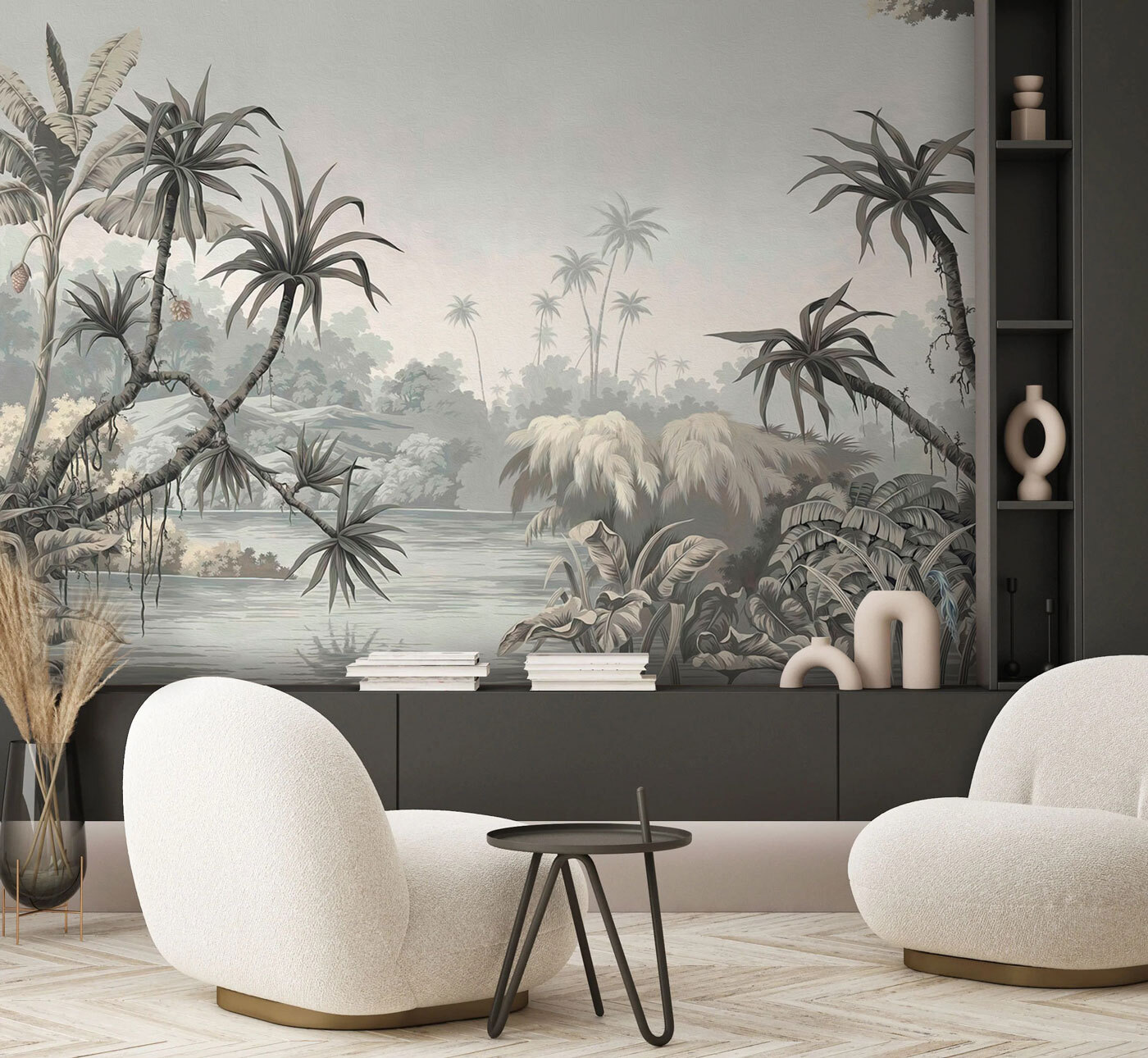 Imagínese descansando en su salón y, en lugar de contemplar paredes en blanco, se ve transportado a este sereno oasis tropical justo en su casa. Este mural “Paisaje tropical en tonos apagados” es como un soplo de aire fresco con un toque de misterio selvático. No es demasiado estridente, pero capta el ambiente verde y exuberante del denso follaje y los árboles exóticos.