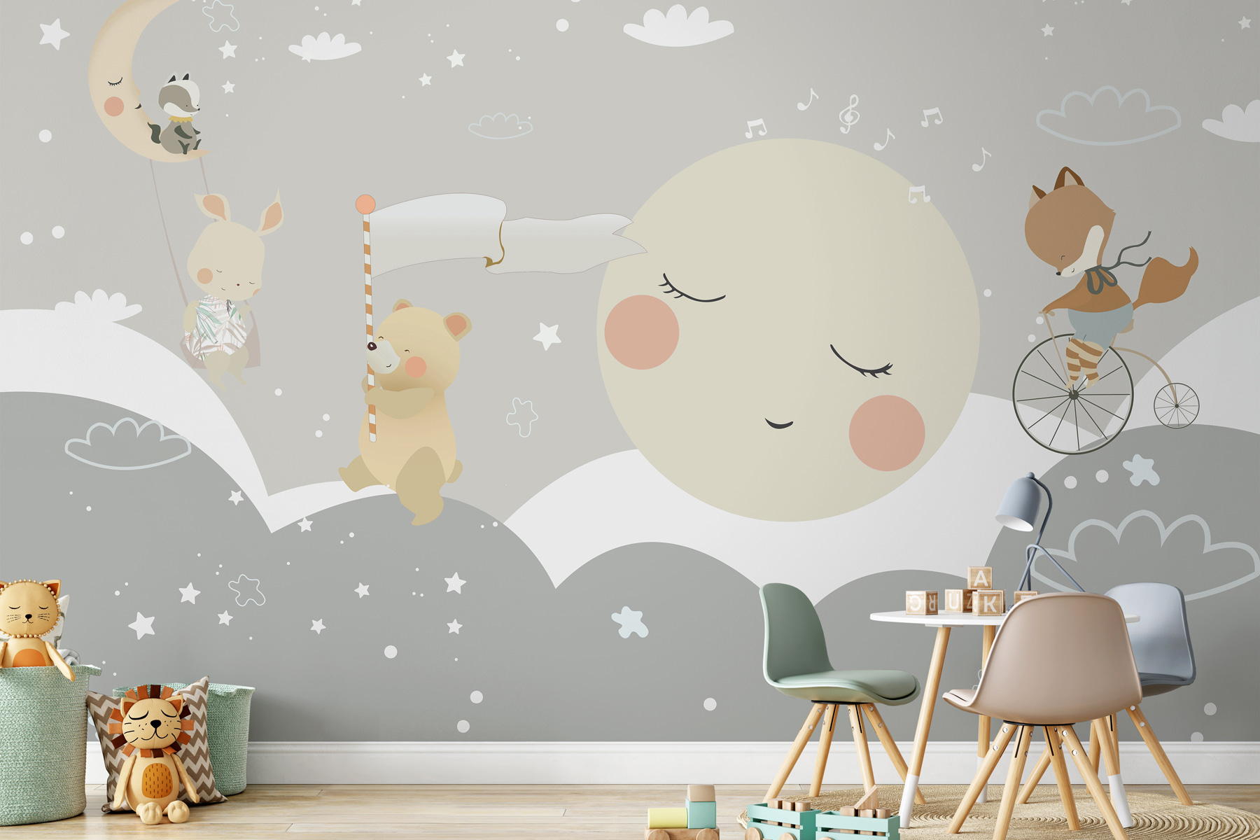 Echa un vistazo a este adorable mural de pared, “Estrella blanca sobre fondo gris”. Es como entrar en un cuento de ensueño perfecto para una habitación infantil o de juegos. Este mural presenta un relajante fondo gris salpicado de estrellas parpadeantes, una luna dormilona y simpáticos amigos animales. Imagínate un oso dormilón y un zorro montado en un caballito: ¡todo un deleite para los pequeños exploradores!