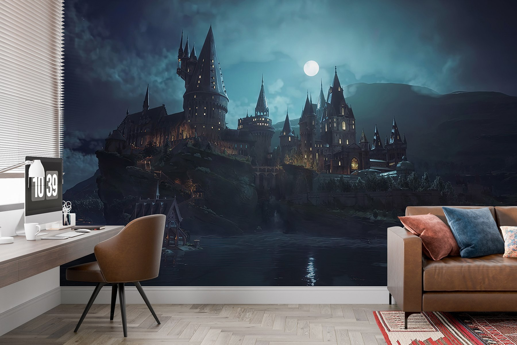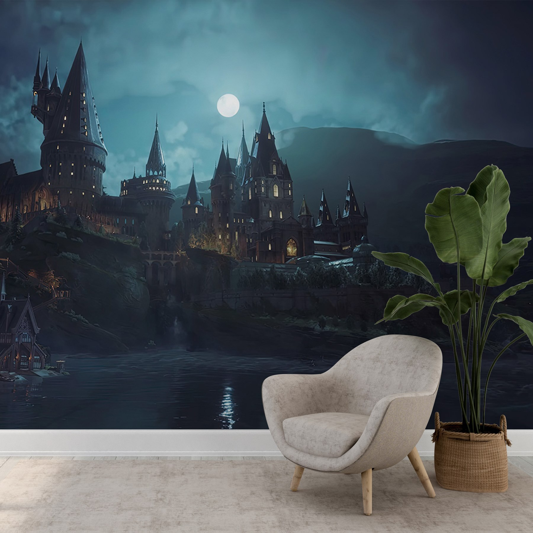 Transforme su espacio en un refugio de ensueño con este encantador mural de pared que muestra un castillo encaramado en una colina bajo una luna resplandeciente. Imagínese acogedoras veladas contemplando las majestuosas torres y disfrutando de la magia de la noche. Es como entrar en un cuento de hadas, justo en tu salón. Los azules suaves y las sombras oscuras crean un ambiente tranquilo, perfecto para relajarse después de un largo día. Incluso puede que tus amigos te pregunten si has estado en otro mundo. Este mural no es sólo arte; invita a soñar despierto y suscita conversaciones, convirtiendo cualquier pared en un cautivador punto focal.