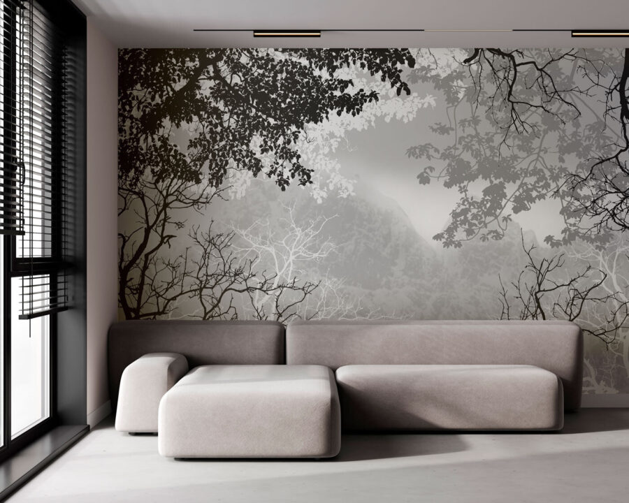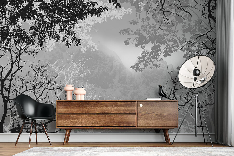 Imagínese sentado en el salón de su casa, con una taza de té en la mano, mientras contempla este tranquilo mural de ramas de árbol con un brumoso telón de fondo montañoso. Es como trasladar un rincón sereno de un bosque brumoso al interior de su espacio. Casi esperas oír el canto de los pájaros y el susurro de las hojas. La mezcla única de montañas y árboles de este mural crea un efecto calmante y dramático a la vez, perfecto para los amantes de la naturaleza o para cualquiera que desee un toque salvaje. Además, es en blanco y negro, lo que le da ese aire clásico y atemporal, sin desentonar con la decoración existente. Así que, tanto si trabajas desde casa como si simplemente te relajas un domingo, este mural te envolverá en el abrazo de la naturaleza, menos los bichos.