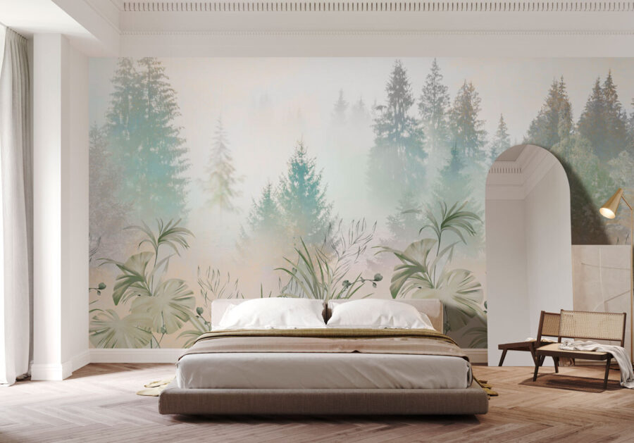 Imagine despertarse cada día con las serenas vibraciones de un bosque neblinoso, justo en su salón. Eso es lo que le ofrece este mural “Bosque brumoso con exuberante vegetación”. Es como tener un trozo de tranquilidad y naturaleza en su pared sin salir de la comodidad de su hogar. Los suaves verdes y la neblina crean un efecto calmante que es perfecto para cualquier espacio que busque un toque de naturaleza.