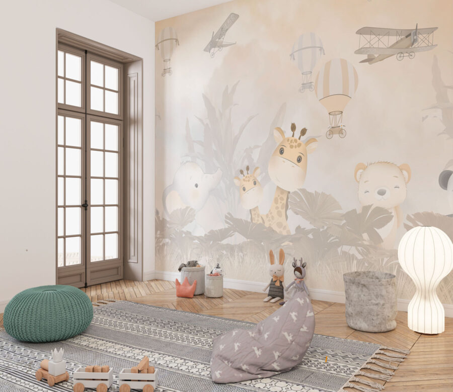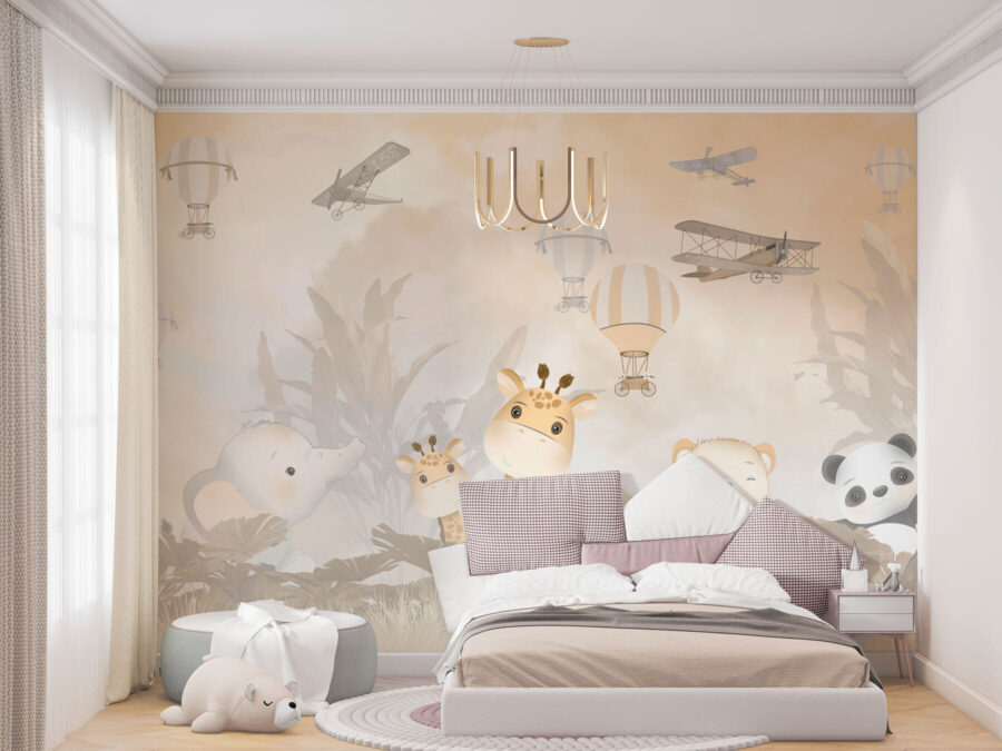 Perfecto para hijos e hijas, este mural transmite una sensación de aventura y asombro. Los tonos suaves y apagados lo convierten en una adición serena sin abrumar la habitación. Imagínese a su hijo mirando hacia arriba con gran curiosidad, tal vez contando historias de escapadas de altos vuelos o paseos en elefante bajo cielos llenos de globos.