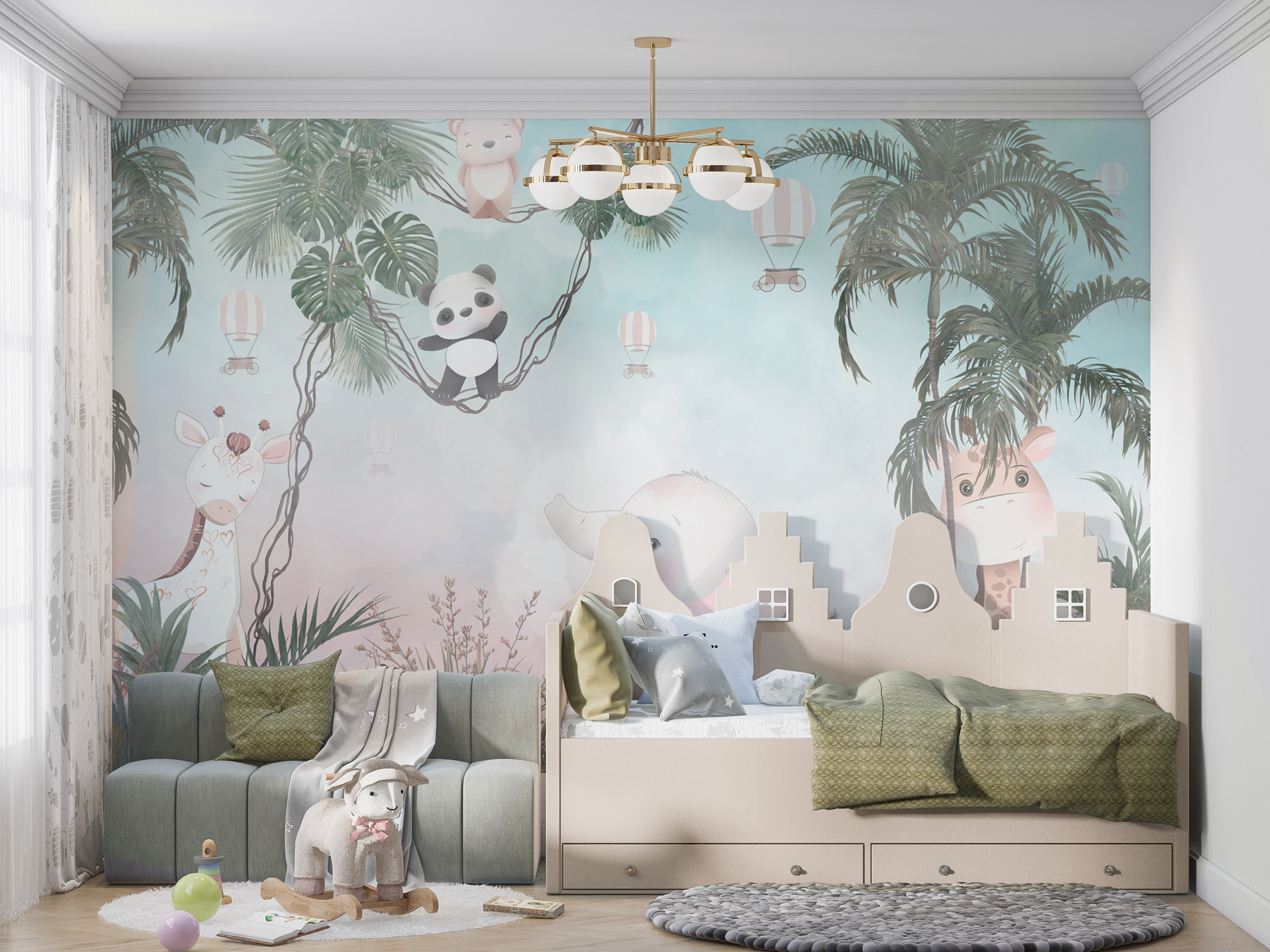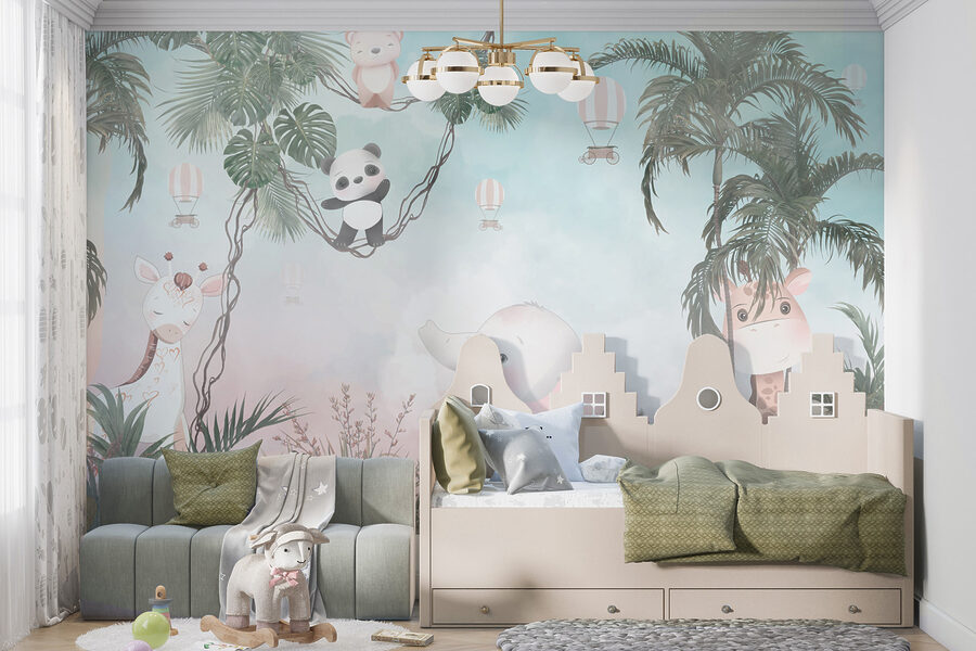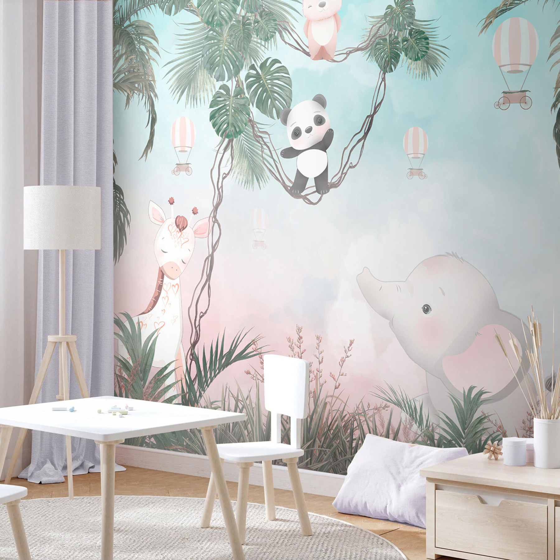 Transforma cualquier pared aburrida en una aventura con este mural con un panda de dibujos animados demasiado adorable. Imagínatelo: una acogedora habitación infantil en la que tu pequeño puede imaginarse columpiándose entre los árboles junto a un simpático panda y un elefante que parece dispuesto a soltar unas tiernas risitas. Los colores suaves crean un telón de fondo relajante, perfecto para la siesta o la hora del cuento. Es como una escapada a la selva en casa. Imagina esas sonrisas cuando los invitados entren y vean esta alegre escena: prácticamente invita a la alegría y a la imaginación en la habitación. Es una forma fácil de hacer que un espacio parezca un mini safari.