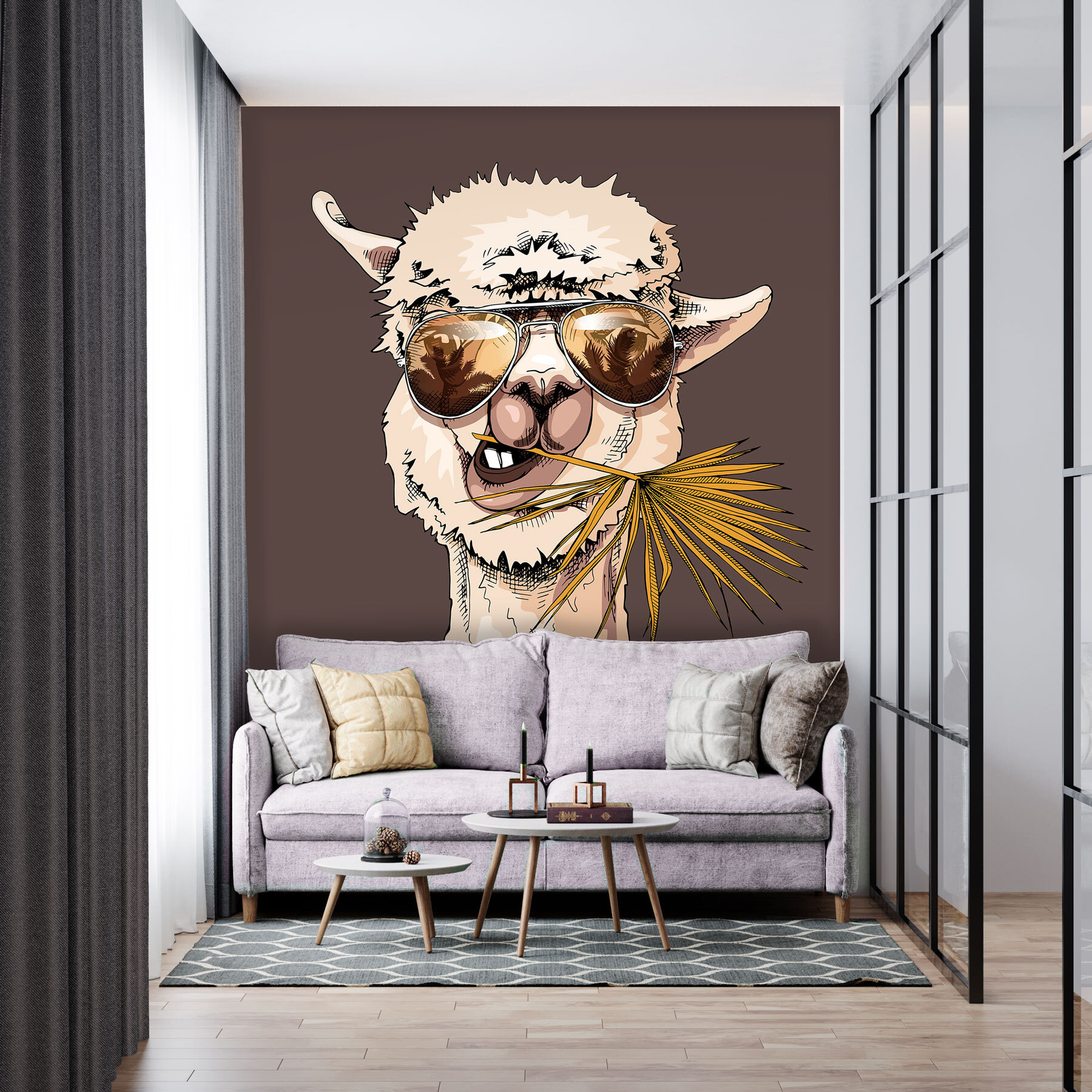 ¿Alguna vez te ha saludado una llama? Pues esta es tu oportunidad. Este mural de pared muestra una llama muy elegante que se balancea en las sombras, totalmente relajada y lista para aportar diversión a tu espacio. Imagínatela en la habitación de un niño o en una zona de juegos; aportará mucho carácter y un toque de fantasía. Tus invitados sonreirán cada vez que lo vean. El fondo marrón apagado lo mantiene contemporáneo, combinando bien con montones de estilos de decoración. Ya sea para un amante de los animales o simplemente para alguien a quien le guste el arte mural único, ¡este mural es una forma segura de alegrar cualquier habitación!