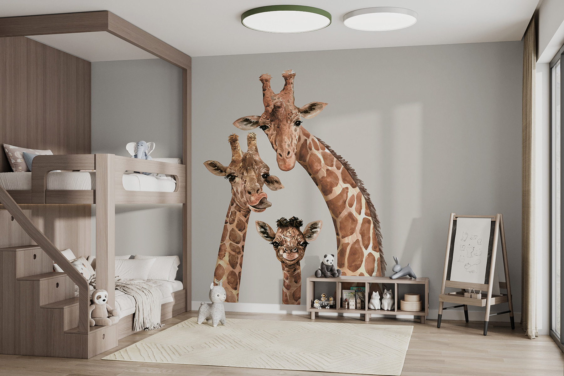 Aquí tiene un poco de diversión y capricho para sus paredes: nuestros “Murales de pared Grupo de jirafas con las cabezas juntas” añadirán un toque de personalidad a cualquier habitación. Fíjese en esas adorables y curiosas caritas. Tanto si está preparando el dormitorio de un niño como si simplemente le gusta un poco de decoración juguetona, estas jirafas le harán sonreír cada vez que las vea.