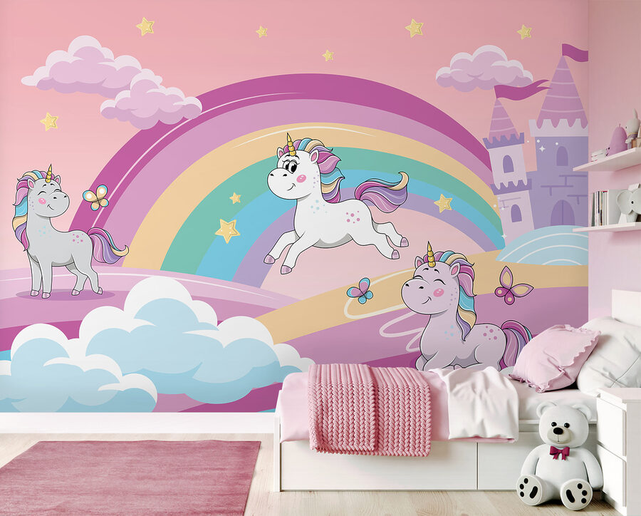 Transforma cualquier habitación ordinaria en una caprichosa escapada con este adorable mural de unicornios. Imagina mariposas bailando alrededor de coloridos arco iris, mientras juguetones unicornios cabalgan bajo un suave cielo rosa. Es como entrar en un libro de cuentos donde la magia está a sólo un latido de distancia. Perfecto para despertar la imaginación de los más pequeños, este mural da una sensación acogedora y divertida, haciendo que cada día parezca una aventura. Seguro que provocará sonrisas y carcajadas, además de una pizca de alegría cada vez que entren. ¿Quién no querría un poco de magia de cuento de hadas en sus paredes?