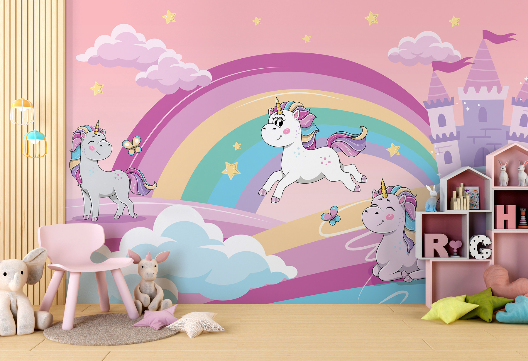 Transforma cualquier habitación ordinaria en una caprichosa escapada con este adorable mural de unicornios. Imagina mariposas bailando alrededor de coloridos arco iris, mientras juguetones unicornios cabalgan bajo un suave cielo rosa. Es como entrar en un libro de cuentos donde la magia está a sólo un latido de distancia. Perfecto para despertar la imaginación de los más pequeños, este mural da una sensación acogedora y divertida, haciendo que cada día parezca una aventura. Seguro que provocará sonrisas y carcajadas, además de una pizca de alegría cada vez que entren. ¿Quién no querría un poco de magia de cuento de hadas en sus paredes?