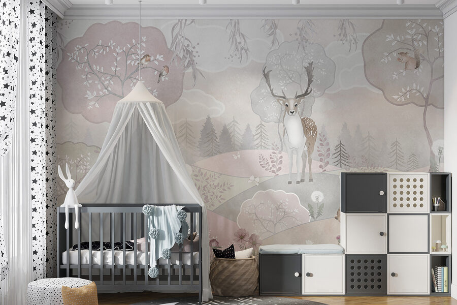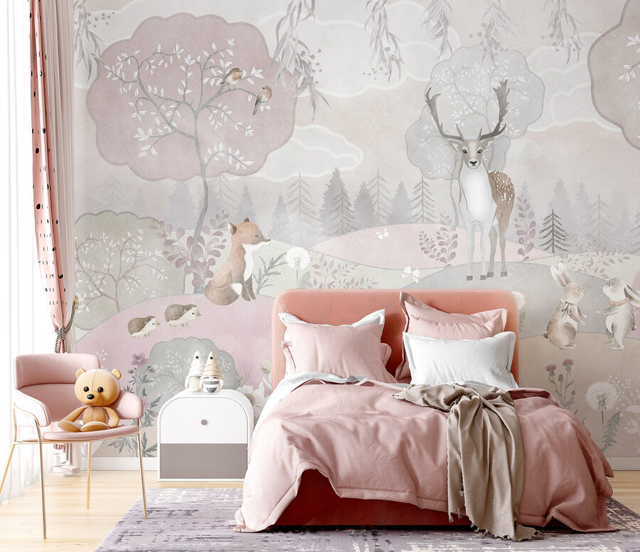 Imagínese entrar en un caprichoso bosque donde un majestuoso ciervo se yergue grácilmente entre juguetones conejitos y curiosos zorritos. Este mural de pared no es sólo una pieza de decoración; es una puerta a una encantadora escena de cuento de hadas. Los suaves colores pastel crean un fondo sereno que invita a la calma y la alegría en cualquier espacio. Perfecto para la habitación de un niño o para cualquier rincón que necesite un toque de magia, está destinado a suscitar conversaciones y sonrisas. Imagina las aventuras de los cuentos bajo la atenta mirada de estas criaturas, recordando a todos que incluso los momentos más sencillos pueden ser puro encanto. Transforma tus paredes en un lienzo de imaginación.
