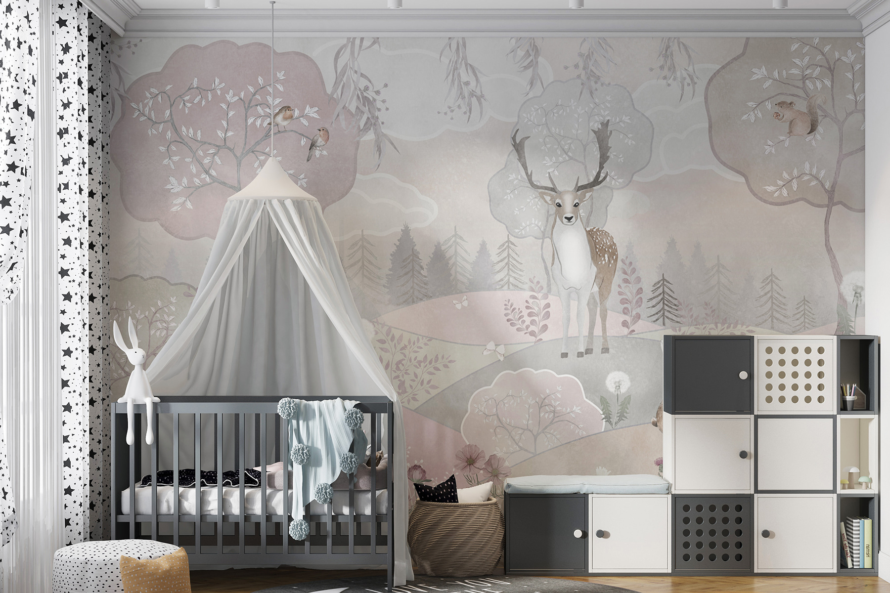 Imagínese entrar en un caprichoso bosque donde un majestuoso ciervo se yergue grácilmente entre juguetones conejitos y curiosos zorritos. Este mural de pared no es sólo una pieza de decoración; es una puerta a una encantadora escena de cuento de hadas. Los suaves colores pastel crean un fondo sereno que invita a la calma y la alegría en cualquier espacio. Perfecto para la habitación de un niño o para cualquier rincón que necesite un toque de magia, está destinado a suscitar conversaciones y sonrisas. Imagina las aventuras de los cuentos bajo la atenta mirada de estas criaturas, recordando a todos que incluso los momentos más sencillos pueden ser puro encanto. Transforma tus paredes en un lienzo de imaginación.