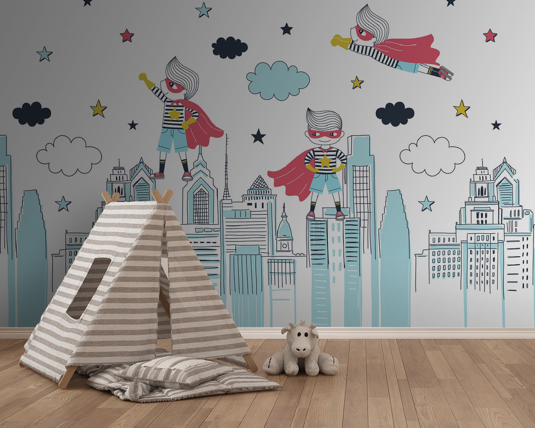 Transforma la habitación de un niño en una vibrante aventura con este mural de pared protagonizado por un juguetón superhéroe. Con un brillante telón de fondo, una figura con capa sobrevuela un paisaje urbano, rodeada de caprichosas nubes y estrellas centelleantes. No es sólo decoración; ¡despierta la imaginación y los sueños de hazañas heroicas! Perfecto para los más pequeños, este mural podría inspirar historias épicas a la hora de dormir e incontables horas de juego. Ya sea una sorpresa para un cumpleaños o una simple actualización, este mural puede hacer que la habitación parezca una divertida escapada. ¿Quién no querría saltar a un mundo de aventuras cada vez que entra?
