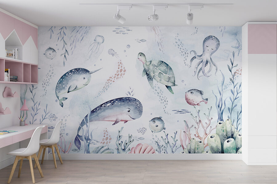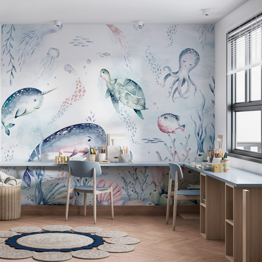 Hola a todos. ¿Alguna vez has imaginado sumergirte en un mundo submarino de ensueño cada vez que entras en una habitación? Pues este mural de acuarela te ayudará. Es como una caprichosa salpicadura de la magia del océano, con una tortuga súper relajada deslizándose por un mar encantador. Perfecto para niños, bebés o cualquier persona a la que le guste el ambiente marino. Los colores apagados pero vivos crean una escena oceánica serena, casi juguetona, con adorables criaturas marinas flotando alrededor, como si el propio océano diera un beso a tus paredes. No es sólo decoración, ¡es una miniaventura a punto de ocurrir!