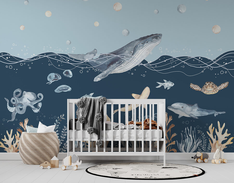 Imagine convertir su habitación en un paraíso submarino con el mural de pared “Acuarela de una ballena”. Es una hermosa mezcla de azules serenos y juguetonas criaturas marinas, perfecta para añadir un toque de magia a cualquier espacio. Ya sea para la habitación de un niño, un cuarto infantil o simplemente porque le encanta el océano, este mural es perfecto para usted.