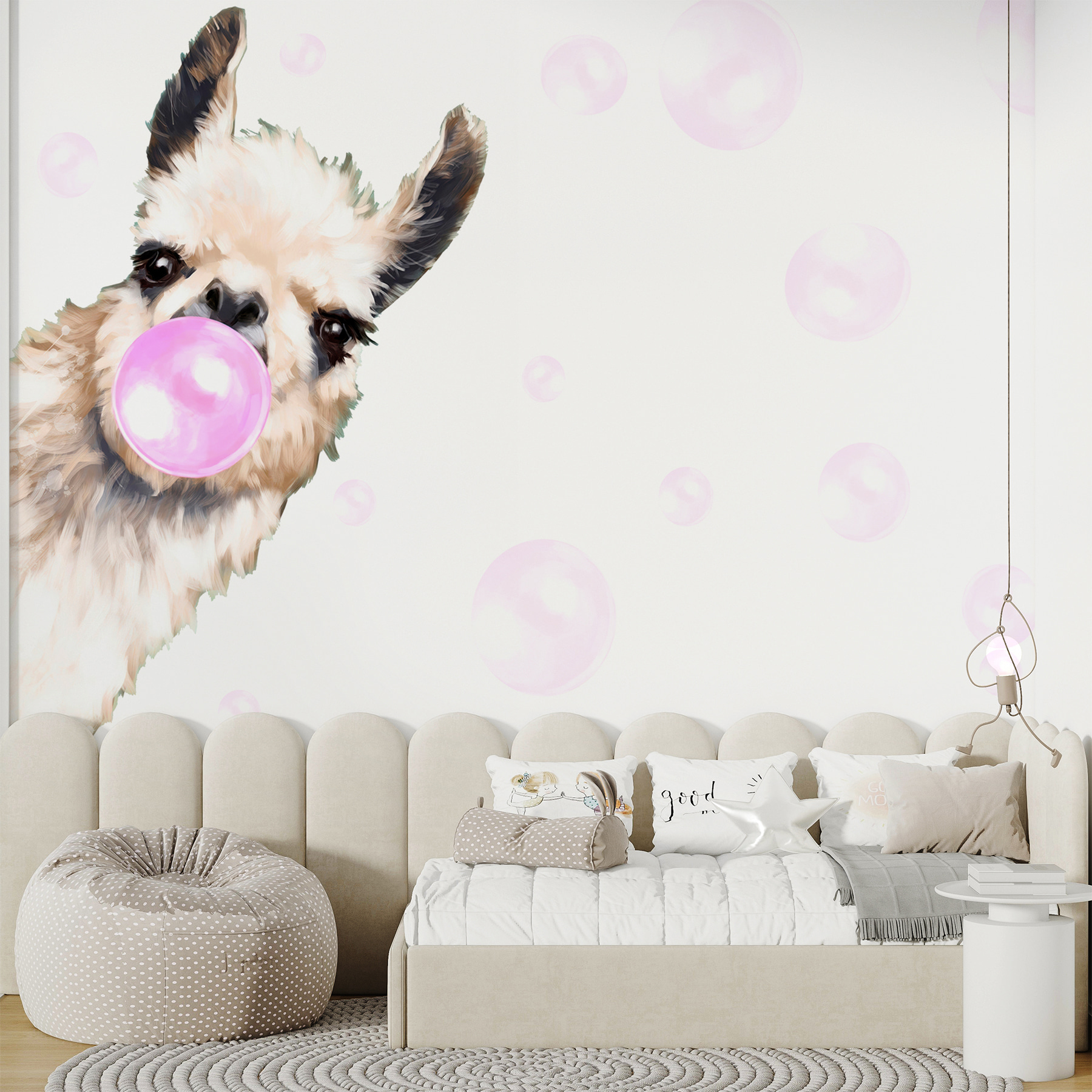 Imagina que entras en una habitación y te recibe una llama soplando una burbuja rosa: ¡es divertido al instante! Este mural no es sólo decoración; es como tener un amigo estrafalario en la pared. Perfecto para la habitación de una niña o el lugar de reunión de un adolescente, captura ese espíritu juguetón que provoca sonrisas. Los colores suaves y el diseño extravagante aportan un aire desenfadado, creando un espacio alegre y acogedor a la vez. Imagínate la alegría o las risas que podría inspirar durante una noche de cine. No es sólo una pared, es toda una experiencia. Perfecto para cualquiera que desee inyectar un poco de alegría a su espacio.
