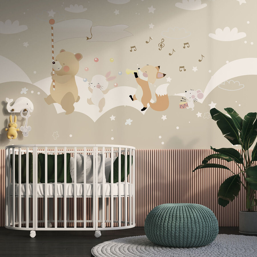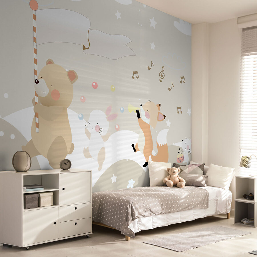 Transforma la habitación de un niño en un caprichoso país de las maravillas con este encantador mural en el que aparece un alegre osito de peluche y su alegre grupo de amigos del bosque. Imagina a los más pequeños despertándose con una escena juguetona en la que un osito de peluche agita un bastón de caramelo como una bandera, invitando a sueños llenos de dulzura y diversión. Hay un zorro bailando y un conejito saltando; ¡es como un pequeño desfile en la pared! Los colores suaves y las expresiones alegres crean una atmósfera relajante, que despierta la imaginación y la risa. Perfecto para cuartos de juegos o guarderías, es el tipo de decoración que convierte los momentos cotidianos en una aventura: ¿quién sabe qué historias se desarrollarán aquí? Un toque sencillo que causa un gran impacto.
