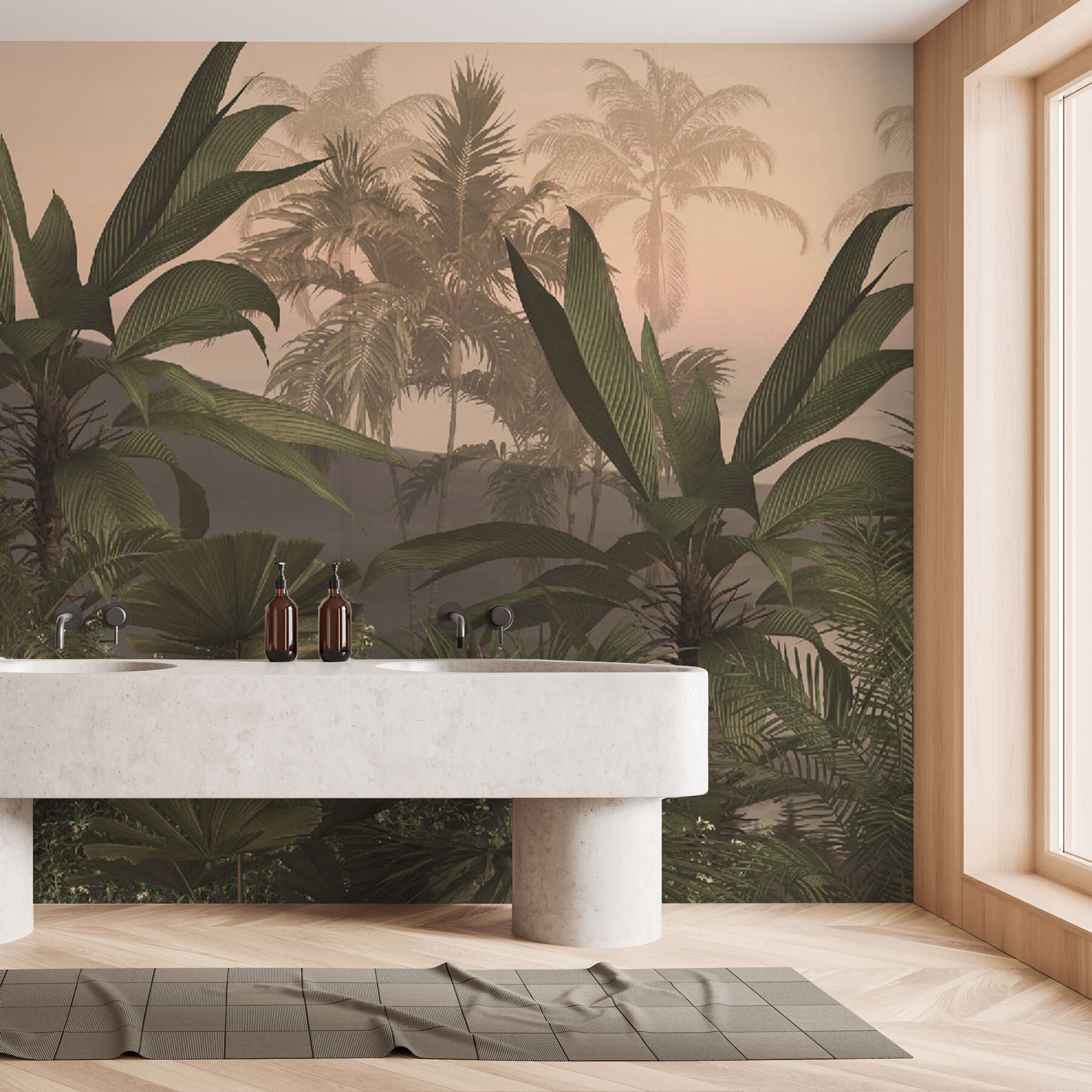 El fondo suave y brumoso mezclado con las vibrantes hojas verdes hace que cualquier espacio se sienta vivo y fresco. Ya sea en el salón, en el dormitorio o incluso en el despacho, te hará sentir como en una escapada constante. ¿Y lo mejor? ¡Sin bichos! Sólo tranquilidad infinita y un toque de encanto exótico en tus paredes.