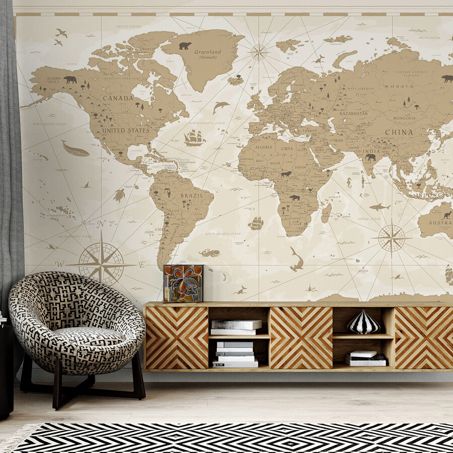 Piénsalo: una lección diaria de geografía desde tu sofá. Los niños pueden soñar con lugares lejanos, ¿y los adultos? Bueno, puede que te despierte el deseo de viajar o te recuerde tu último gran viaje. Los tonos apagados hacen que combine sin esfuerzo con cualquier decoración. Además, todos estos pequeños y divertidos detalles -animales, barcos y esas rosas de brújula de la vieja escuela- añaden un toque de encanto vintage. No es sólo un mural; es como un libro de cuentos gigante para tu pared. Absolutamente perfecto para cualquier apasionado de la aventura.