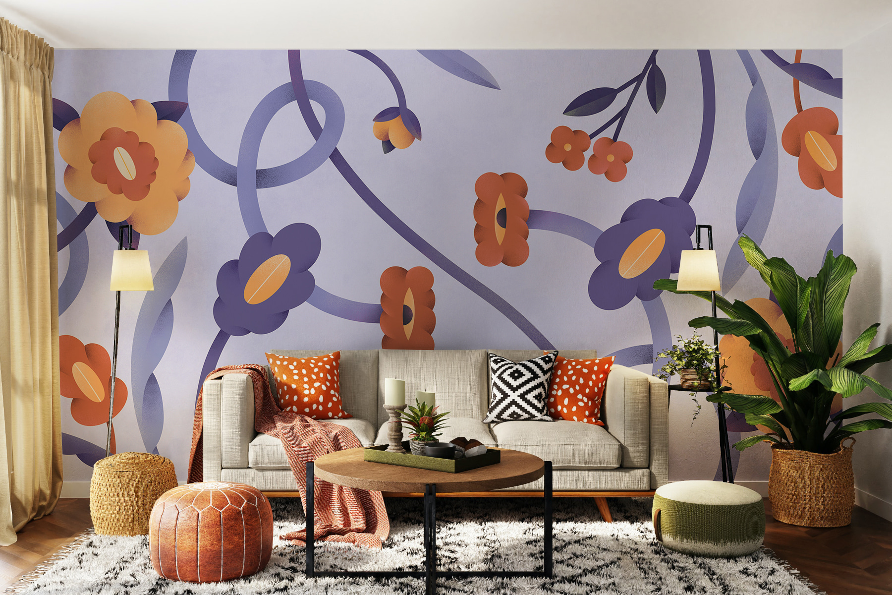 “Murales de flores y enredaderas moradas y naranjas” es como entrar en un jardín alegre y de ensueño. Esas enredaderas y flores entrelazadas en un atrevido morado y un soleado naranja rebosan energía. Imagínese que se despierta con esta vibrante escena: ¡le levanta el ánimo al instante! Es como tener un toque de verano en la pared, en cualquier estación del año.