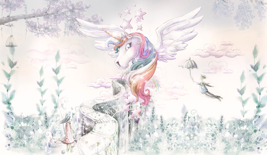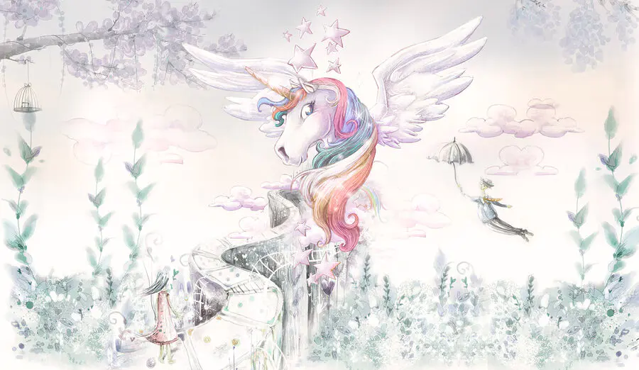 ¿Busca un toque de magia en la habitación de su hijo? Eche un vistazo a este mural “Unicornio con alas y pelo arco iris”. Imagínese despertarse con una escena sacada directamente de un cuento de hadas: un caprichoso unicornio con el pelo de un arco iris de colores pastel, rodeado de nubes suaves y estrellas centelleantes. Es como el sueño de cualquier niño, ¡pintado en su pared! Este mural encaja a la perfección en guarderías y habitaciones de niños pequeños, haciéndoles sentir como si hubieran saltado a su libro de cuentos favorito. Dulcemente discreto, pero totalmente encantador, despierta la alegría y un sinfín de historias. Perfecto para el país de las maravillas de los más pequeños o para cualquier amante de los unicornios. 🌈🦄
