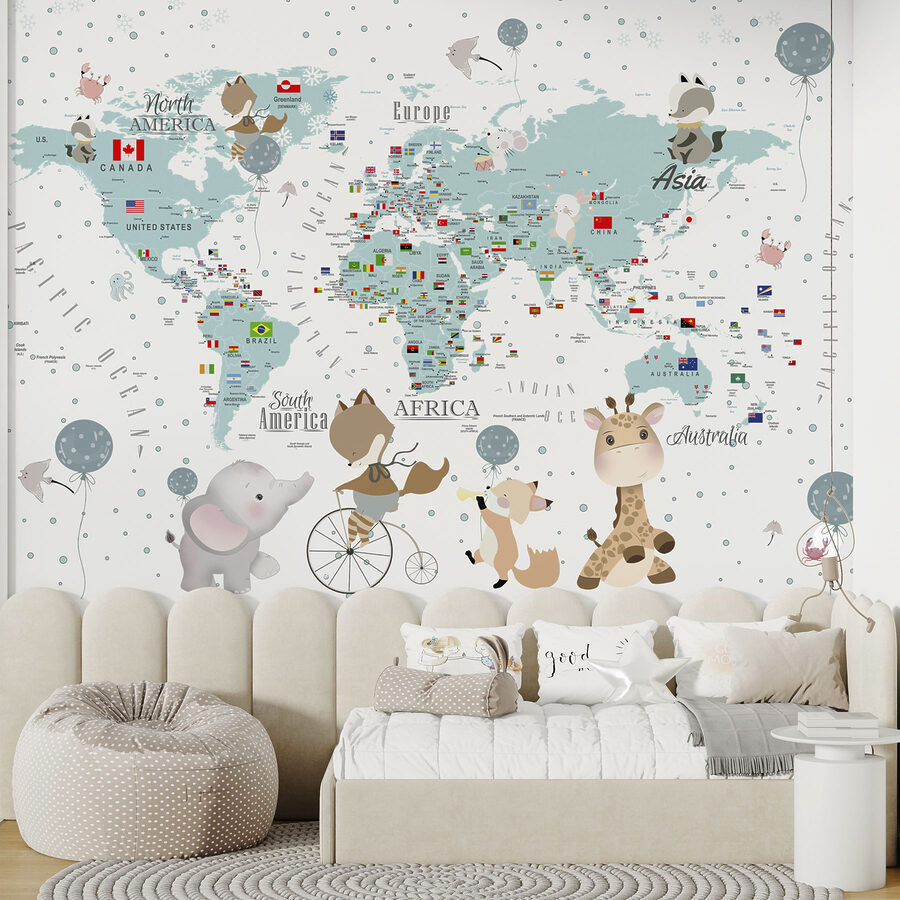 Transforma la habitación de un niño en una zona de aventuras lúdicas con el “Mural de pared Mapa del mundo con animales”. Este encantador mural no es sólo una bonita imagen; es un caprichoso viaje a través de los continentes, salpicado de adorables animales que se divierten de todo. Imagina un elefante montando en bicicleta en el corazón de Sudamérica o una jirafa posando orgullosa en Australia. Es perfecto para despertar la curiosidad y el sentido de la maravilla. Ya sea la primera habitación de un pequeño explorador o un acogedor rincón de lectura, este mural aporta calidez y encanto a cualquier espacio. Además, ¿a quién no le gustaría tener un recordatorio diario del lado salvaje del mundo?