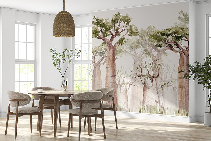 Sumérjase en un paisaje de ensueño con el mural “Baobabs majestuosos en bosque de acuarela”, perfecto para convertir cualquier espacio en un bosque caprichoso. Imagina que entras en una habitación donde estos imponentes baobabs te saludan con su suave encanto de acuarela. A los niños les encantaría, se sentirían como mini exploradores en un bosque exuberante y mágico. Los tonos suaves aportan ese ambiente acogedor de la naturaleza al tiempo que añaden un poco de misticismo. Piensa en una habitación infantil o de juegos transformada en un refugio encantador; es como si la hora del cuento acabara de mejorar. Los suaves tonos verdes y terrosos son muy tranquilizadores, por lo que es ideal para un rincón de lectura o incluso como telón de fondo para la relajación diaria. Es ideal para cualquiera que quiera darle un toque tropical y un toque de creatividad a su hogar. Prepárate para recibir todos los cumplidos y, posiblemente, algunos “¡oh!” y “¡ah!”.