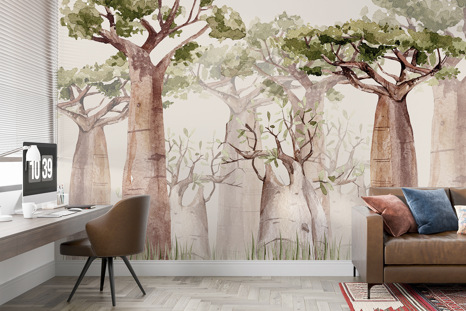Sumérjase en un paisaje de ensueño con el mural “Baobabs majestuosos en bosque de acuarela”, perfecto para convertir cualquier espacio en un bosque caprichoso. Imagina que entras en una habitación donde estos imponentes baobabs te saludan con su suave encanto de acuarela. A los niños les encantaría, se sentirían como mini exploradores en un bosque exuberante y mágico. Los tonos suaves aportan ese ambiente acogedor de la naturaleza al tiempo que añaden un poco de misticismo. Piensa en una habitación infantil o de juegos transformada en un refugio encantador; es como si la hora del cuento acabara de mejorar. Los suaves tonos verdes y terrosos son muy tranquilizadores, por lo que es ideal para un rincón de lectura o incluso como telón de fondo para la relajación diaria. Es ideal para cualquiera que quiera darle un toque tropical y un toque de creatividad a su hogar. Prepárate para recibir todos los cumplidos y, posiblemente, algunos “¡oh!” y “¡ah!”.