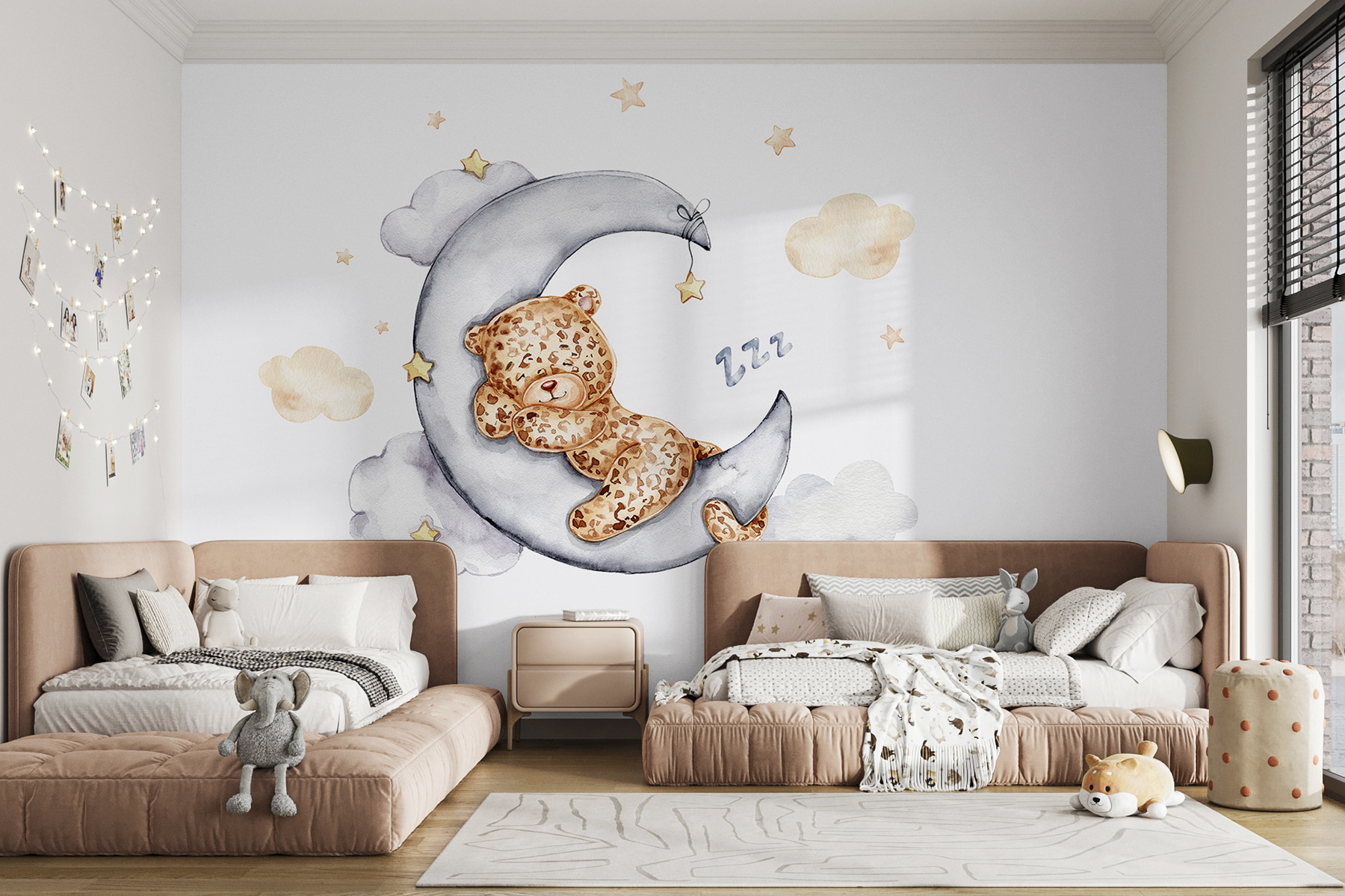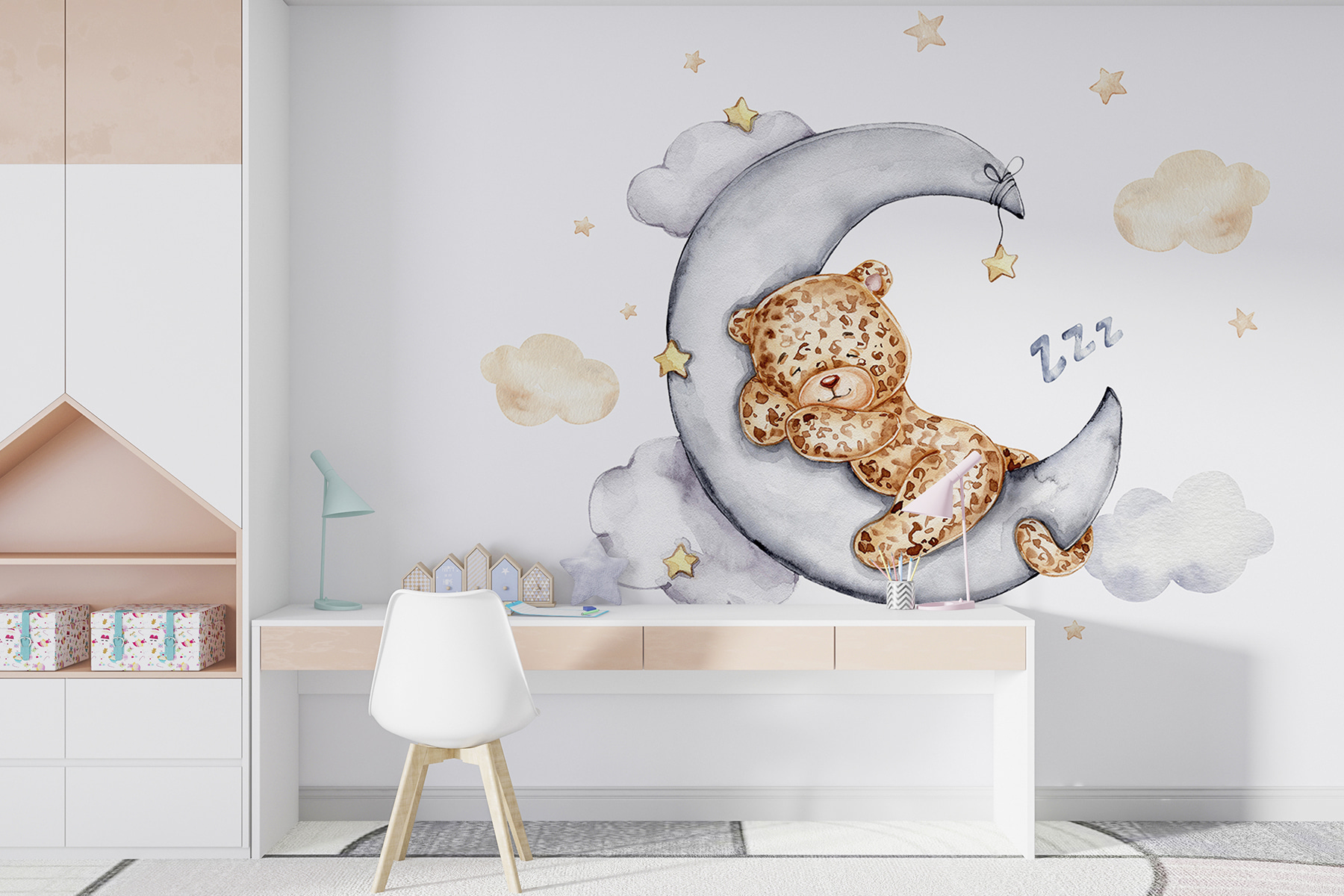 Imagine mirar hacia arriba y ver un adorable osito de peluche durmiendo la siesta en la luna. Este mural de pared “Osito durmiendo en la luna” es perfecto para añadir un toque de magia a la habitación de cualquier niño. Es perfecto para guarderías o habitaciones infantiles que necesiten un toque de fantasía. Imagina esas noches tranquilas y soñadoras con este dulce oso vigilando. Los colores suaves y el diseño juguetón hacen que la hora de dormir resulte acogedora y encantadora. En serio, ¡es como un cálido abrazo a la pared! Cualquiera que lo vea sonreirá. Además, es un gran tema de conversación para cualquier habitación. ¡Un toque encantador que añade pura alegría!