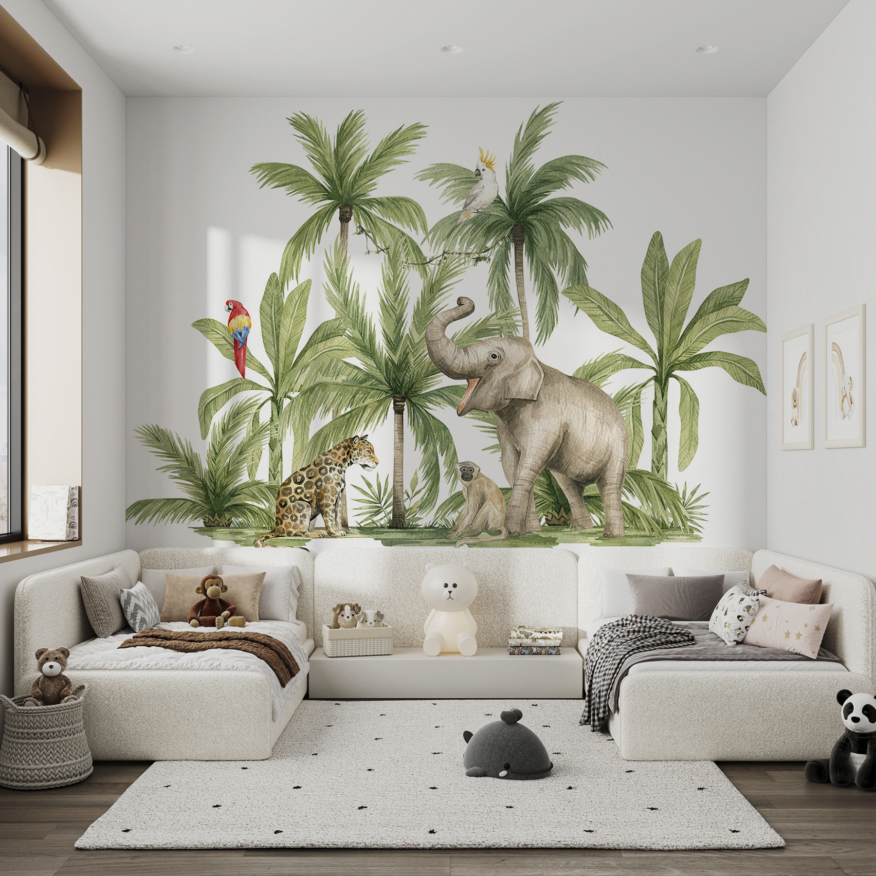 Transforma cualquier habitación en una vibrante aventura en la jungla con este caprichoso mural de pared que muestra animales juguetones entre palmeras que se mecen. Imagina que entras en un espacio donde te saludan un elefante, un mono descarado y un colorido loro: ¿quién no sonreiría? Perfecto para habitaciones infantiles o incluso para un rincón acogedor de tu salón, añade un toque de encanto natural. Además, ¿quién podría resistirse al relajante ambiente de exuberante vegetación? Siéntate y deja que esta escena selvática desate la alegría y la risa, convirtiendo los momentos cotidianos en miniaventuras. Déjate llevar por el lado salvaje, ¡aunque sólo sea por un momento!