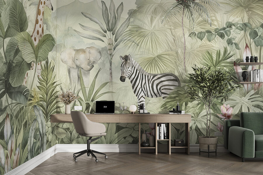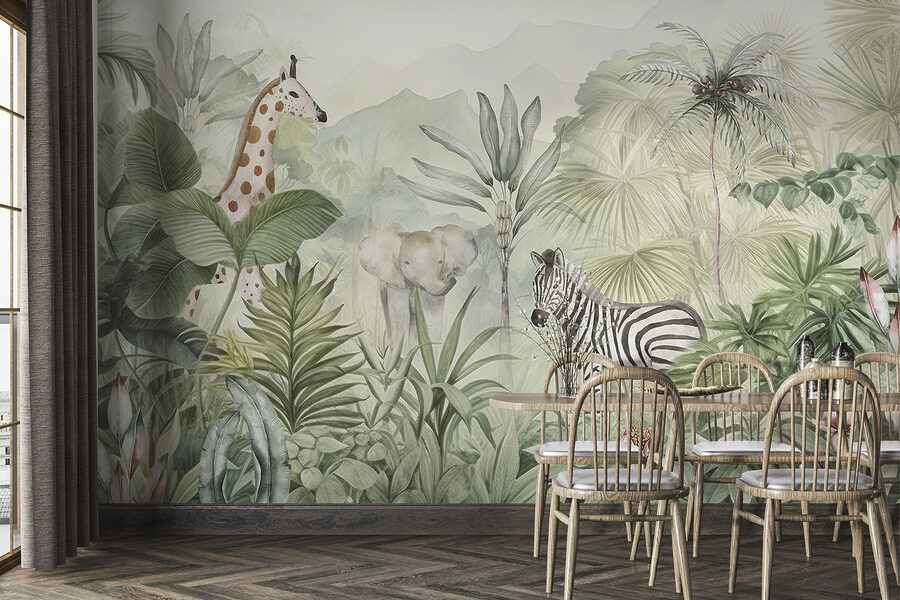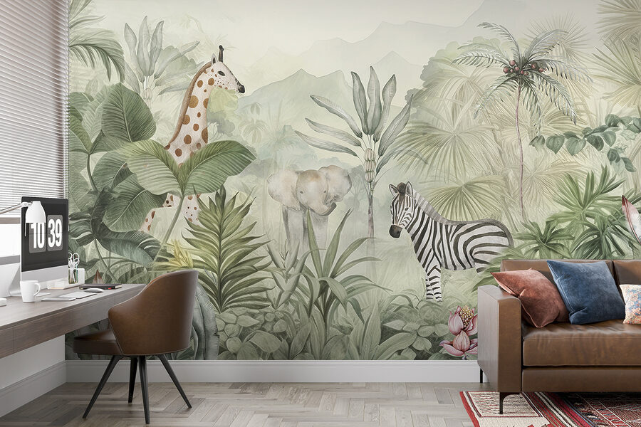Imagínese entrar en una jungla rebosante de vida, ¡pero en su propia habitación! Este mural de pared “Animals Roam Tranquil Jungle Landscape” es pura magia para los ojos. Elefantes, cebras y jirafas deambulan tranquilamente por esta exuberante vegetación tan vibrante que casi sentirás la humedad. Ideal para niños y bebés, es una relajante mezcla de aventura y serenidad, que despierta la imaginación más salvaje. Los suaves tonos pastel y los intrincados detalles hacen que destaque en cualquier espacio. Perfecta para los amantes de la naturaleza o para los que quieren evadirse sin salir de casa.