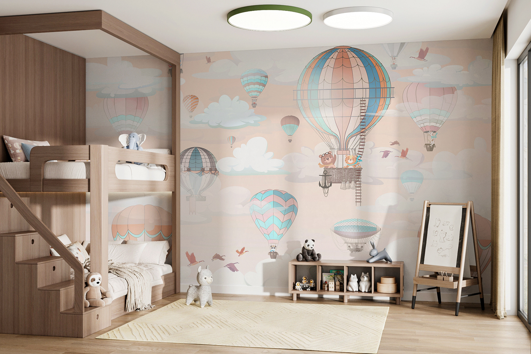 Este mural de pared “Globo aerostático en el cielo” es como entrar en una ensoñación. Imagina a los más pequeños despertándose cada mañana en un cielo lleno de caprichosos globos aerostáticos, flotando entre nubes esponjosas. Es una encantadora mezcla de suaves colores pastel, perfecta para crear un espacio sereno y alegre. Imagínese cuentos para dormir en tierras lejanas o tardes divertidas con amigos, inspirados en esta aventura aérea. No es sólo un mural; es todo un estado de ánimo: ligero, juguetón y absolutamente mágico. Ideal para guarderías o habitaciones infantiles, aporta un toque de diversión e imaginación sin límites.