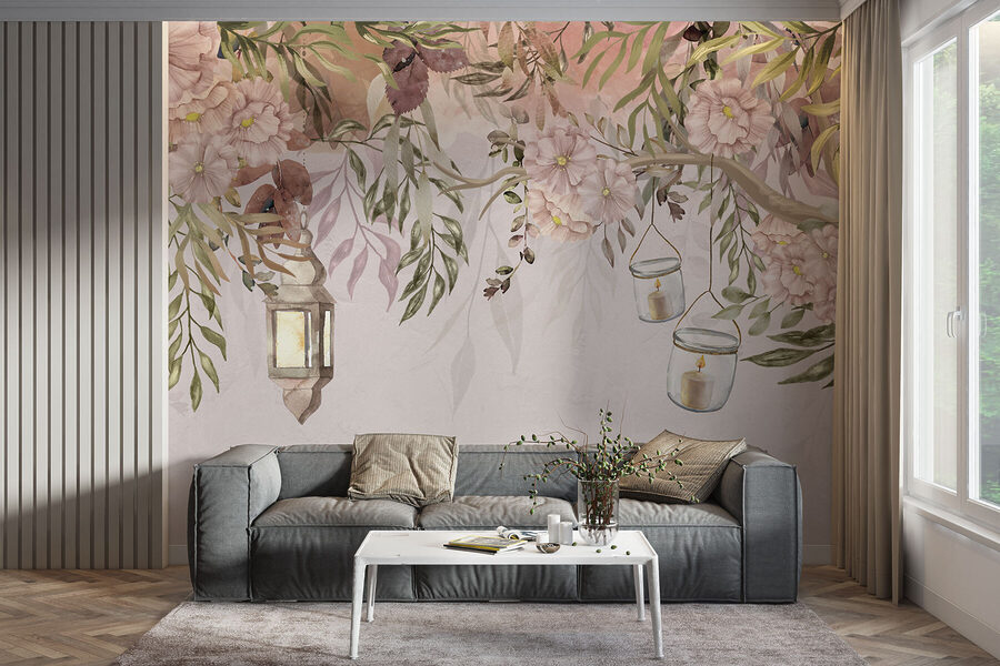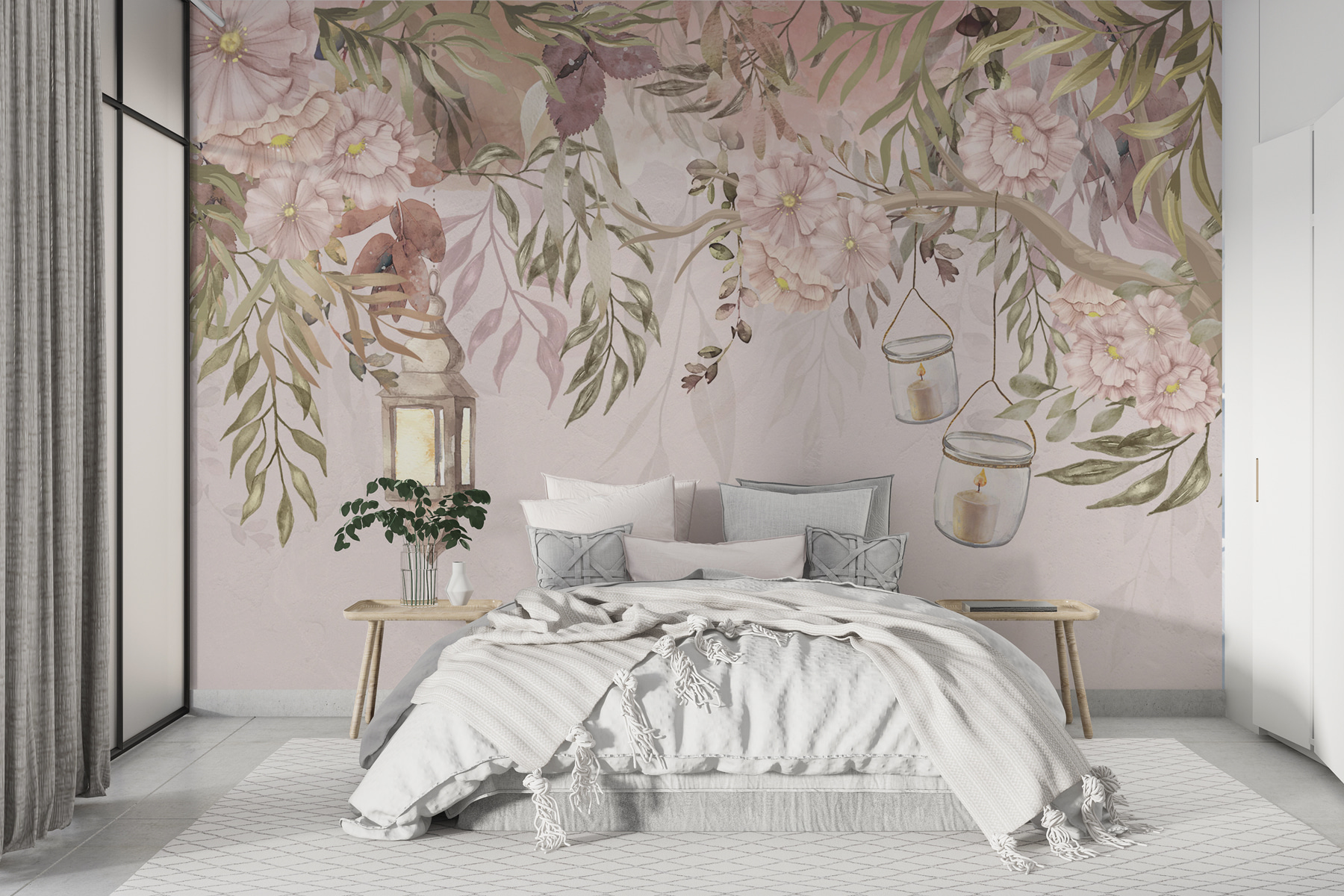 Perfecto para un dormitorio, un salón o incluso una cafetería elegante, este mural transforma cualquier espacio en un refugio caprichoso. ¿Tienes una pared en blanco que pide a gritos un poco de personalidad? Esta es la respuesta. No es sólo una pared; es una experiencia, un elemento que levanta el ánimo, un iniciador de conversaciones. ¿Por qué no dejas que estas flores y farolillos iluminen tu vida?