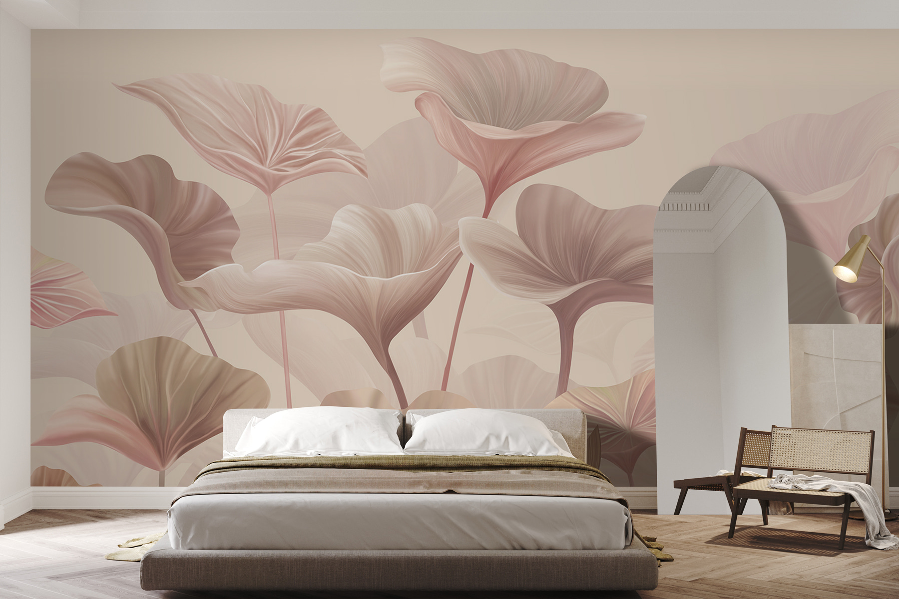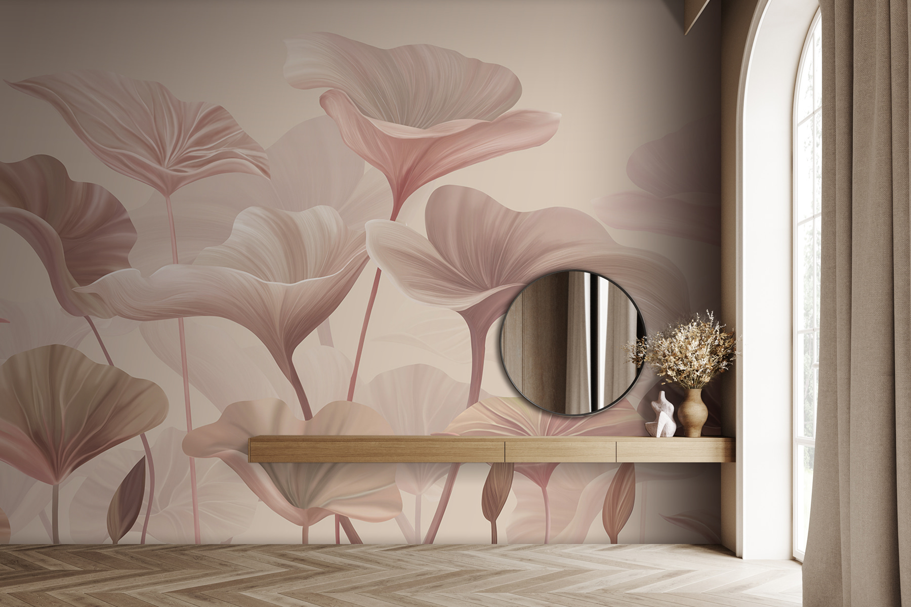 Imagínatelo: entras en una habitación y parece que estés flotando en un jardín de ensueño. Esa es exactamente la sensación que se obtiene con el elegante mural de diseño floral en tonos pastel. Los suaves tonos rosa y beige, con un toque de rosa intenso y crema, crean esta delicada danza de pétalos y hojas que hará que cualquier espacio sea tranquilo y elegante. Es como un suave abrazo de la naturaleza cada vez que entras. Imagina tomar tu café matutino mientras estas flores serenan tus sentidos. Ya sea en tu rincón de lectura, en tu dormitorio o incluso en el pasillo, este mural añade un toque de elegancia sin ser demasiado estridente. Además, está hecho en 3D, por lo que tiene un toque extra que lo hace parecer vivo. Una pequeña escapada, ¡justo en tu pared! 🌸
